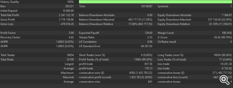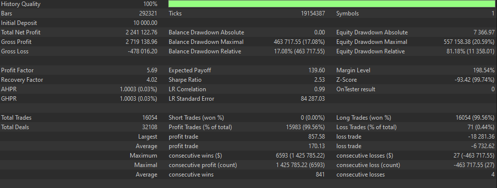 Here are some screenshots of the backtest on half of the development environment ($10k leverage 1:500 since 01/01/2025).