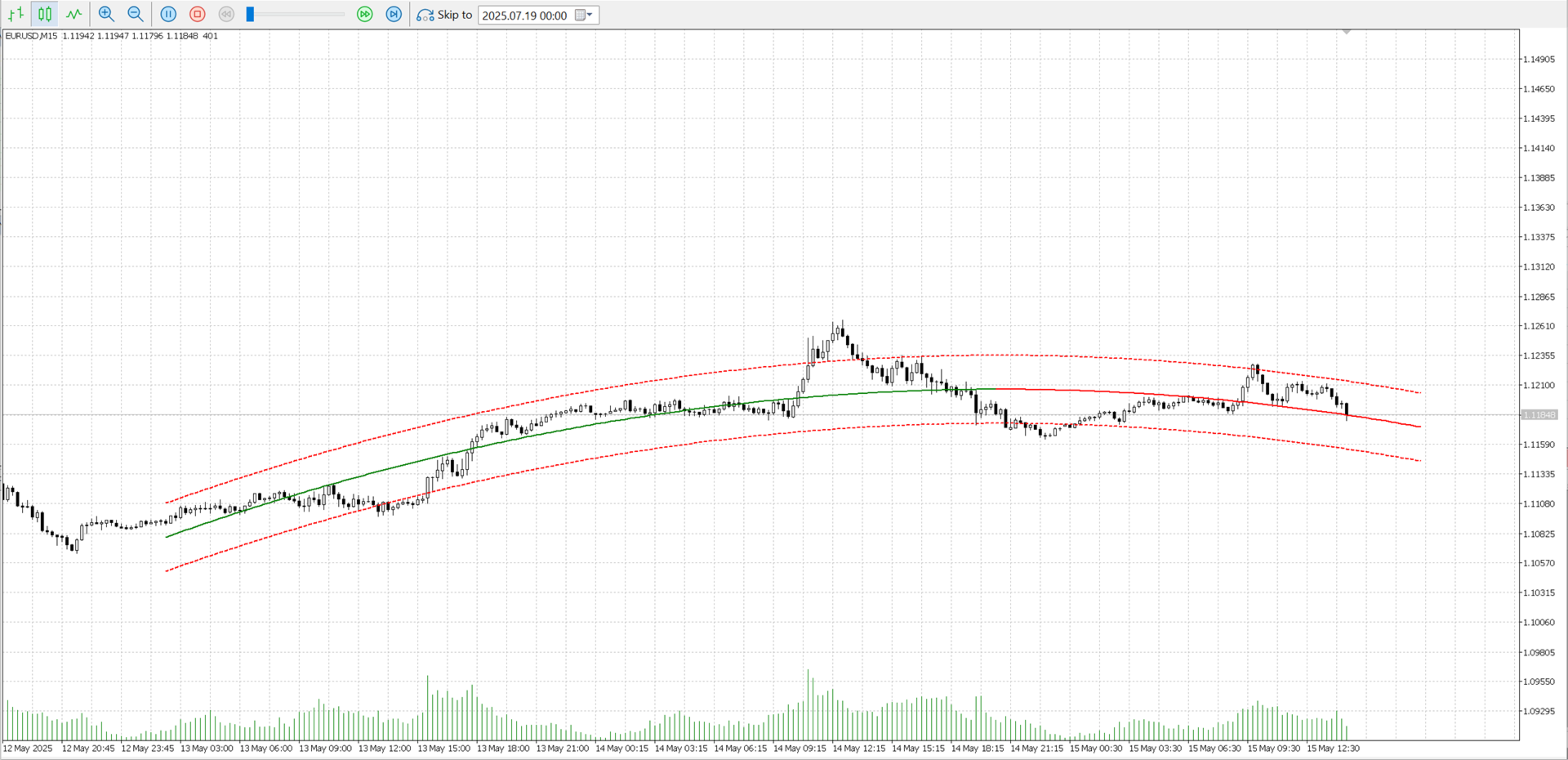 Dynamische visuelle Einblicke: Die Kurven und Kanäle des Indikators passen sich in Echtzeit an, wenn neue Kursdaten eintreffen. Die mittleren, oberen und unteren Bänder weisen außerdem dynamische Farbänderungen auf, die mit den Ableitungen des Polynoms verknüpft sind und visuelle Hinweise auf Richtung und Beschleunigung bieten.