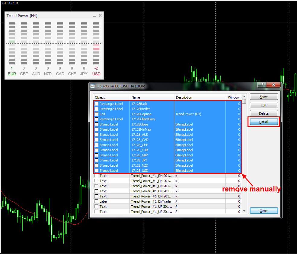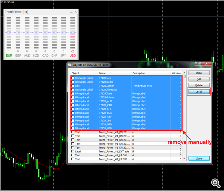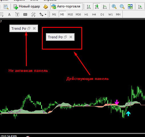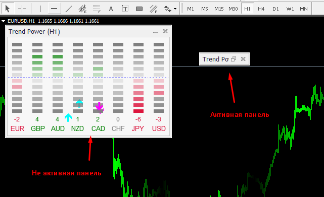При сохранении шаблона, сохраняются не только индикаторы, эксперты и их параметры. Дополнительно сохраняются и графические объекты, в том числе и панель индикатора Trend_Power.