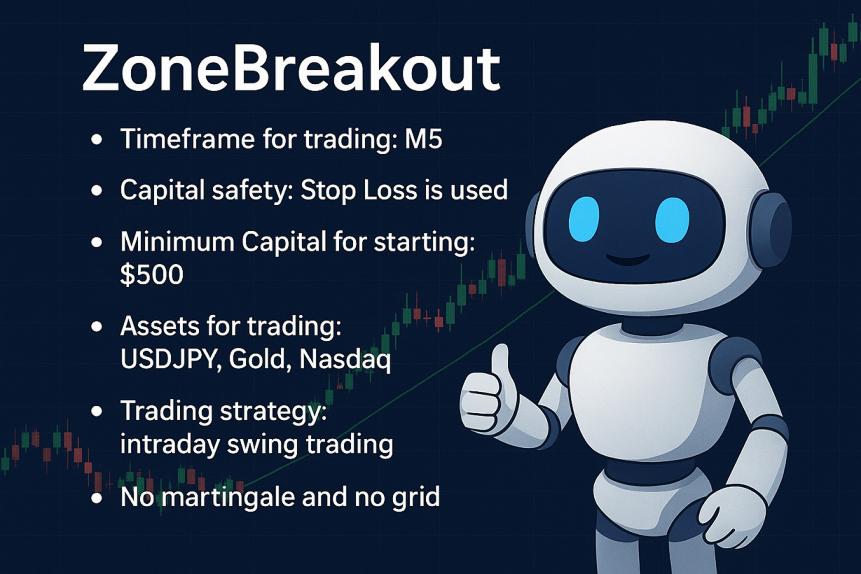 Die Kernidee ist, dass der EA, wie der Name schon sagt, mit Ausbrüchen aus Zonen handelt. Sobald der Bot ein Box-Muster entdeckt, wartet er auf eine Ausbruchs-Bestätigung, indem er eine abgestimmte Kombination von Indikatoren verwendet, um die besten Einstiege zu finden: Er prüft die Volatilität, verwendet Trendfilter und Filter für zusätzliche Bestätigung. Der Bot verwendet einen Stop-Loss für ein gutes Risikomanagement - ob Sie einen Take-Profit verwenden oder den Markt einfach laufen lassen, bleibt ganz Ihnen überlassen.