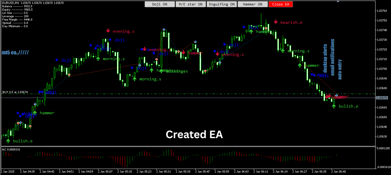 Alle von Click2EA erstellten Roboter können die vier wichtigsten Candlestick-Muster auf Ihrem Chart anzeigen, wenn sie sich bilden.
