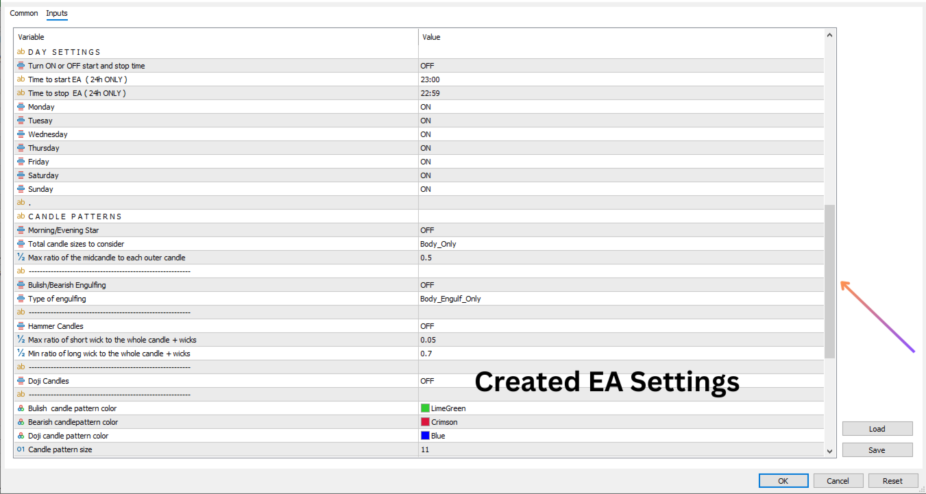 - Montag-Sonntag-Schalter - Hier können Sie wählen, an welchen Tagen der EA läuft.