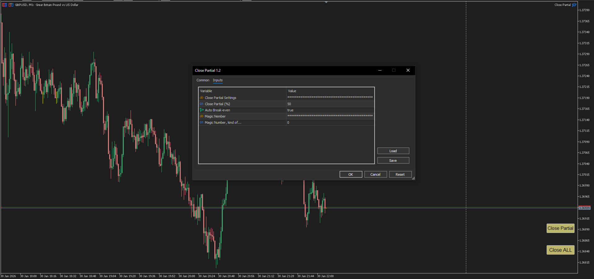 - Schaltfläche Close Partial: Mit dieser Schaltfläche können Sie eine Teilposition schließen. Standardmäßig werden 50 % der Position geschlossen, aber Sie können jeden beliebigen Prozentsatz einstellen (z. B. 10 %, 20 %, 60 %, usw.).