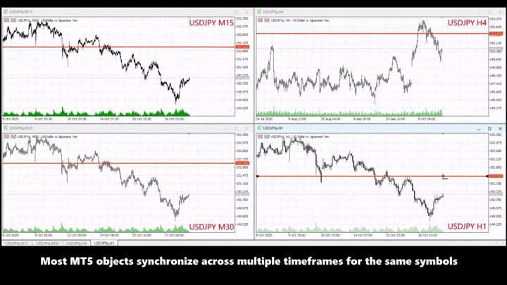 Für Trader, die Multi-Timeframe-Analysen (MTF) durchführen, war das Neuzeichnen derselben Trendlinien oder Fibonacci-Niveaus in jedem Zeitrahmen eine mühsame und zeitaufwändige Aufgabe. Object7SyncX beseitigt diese Ineffizienz vollständig und spart Ihnen wertvolle Analysezeit.