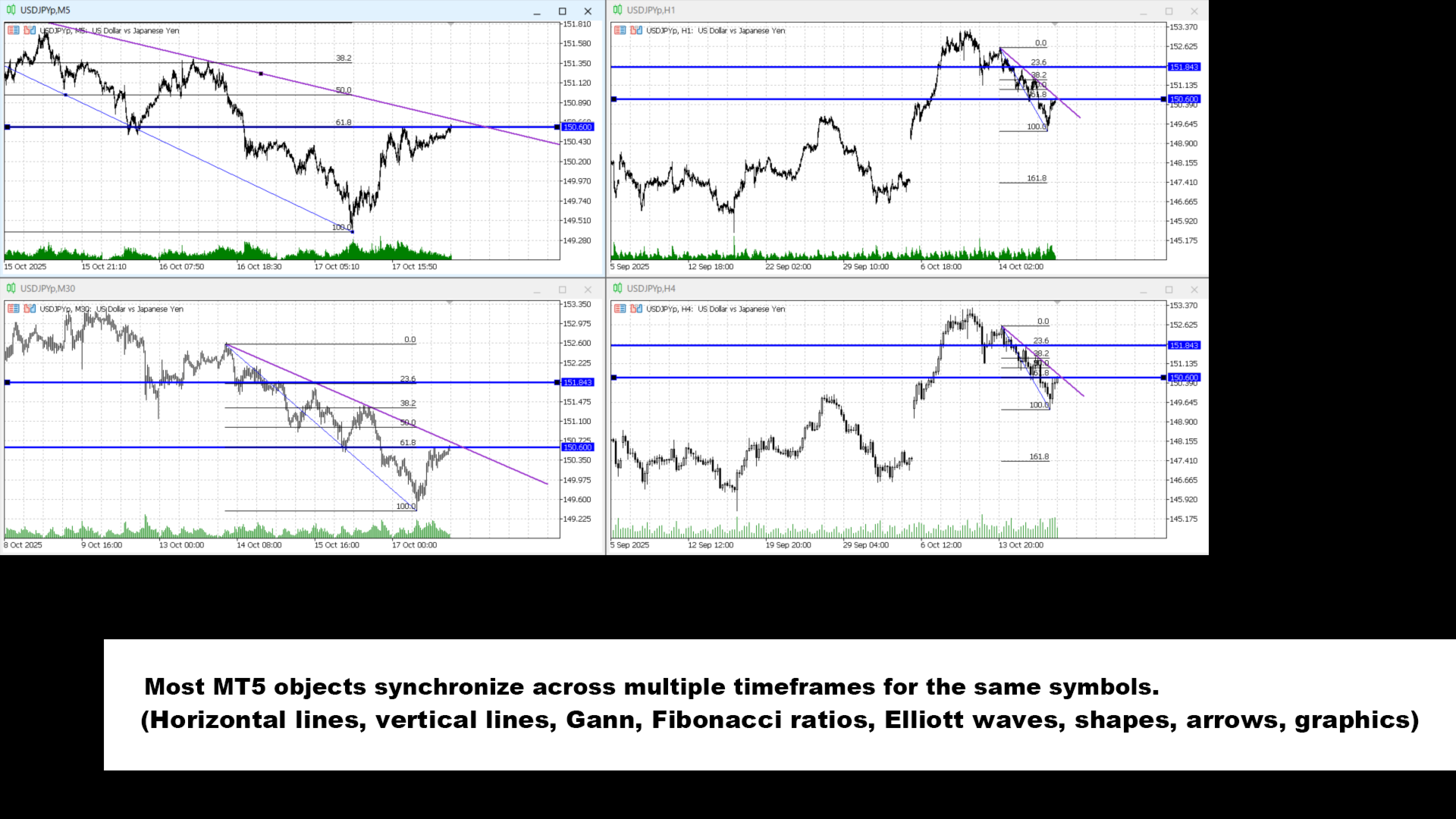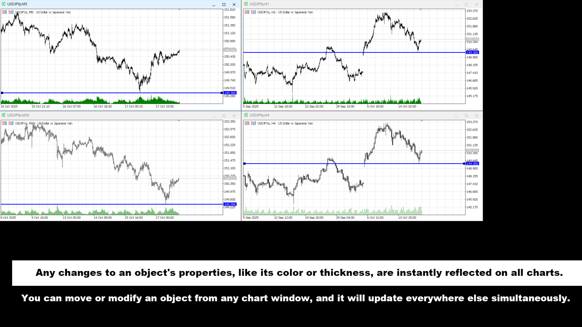 Das Erstellen, Ändern, Ziehen oder Löschen eines Objekts in einem Chart spiegelt diese Aktion sofort in Echtzeit in allen anderen angegebenen Charts wider. Das wiederholte Neuzeichnen derselben Linien entfällt.