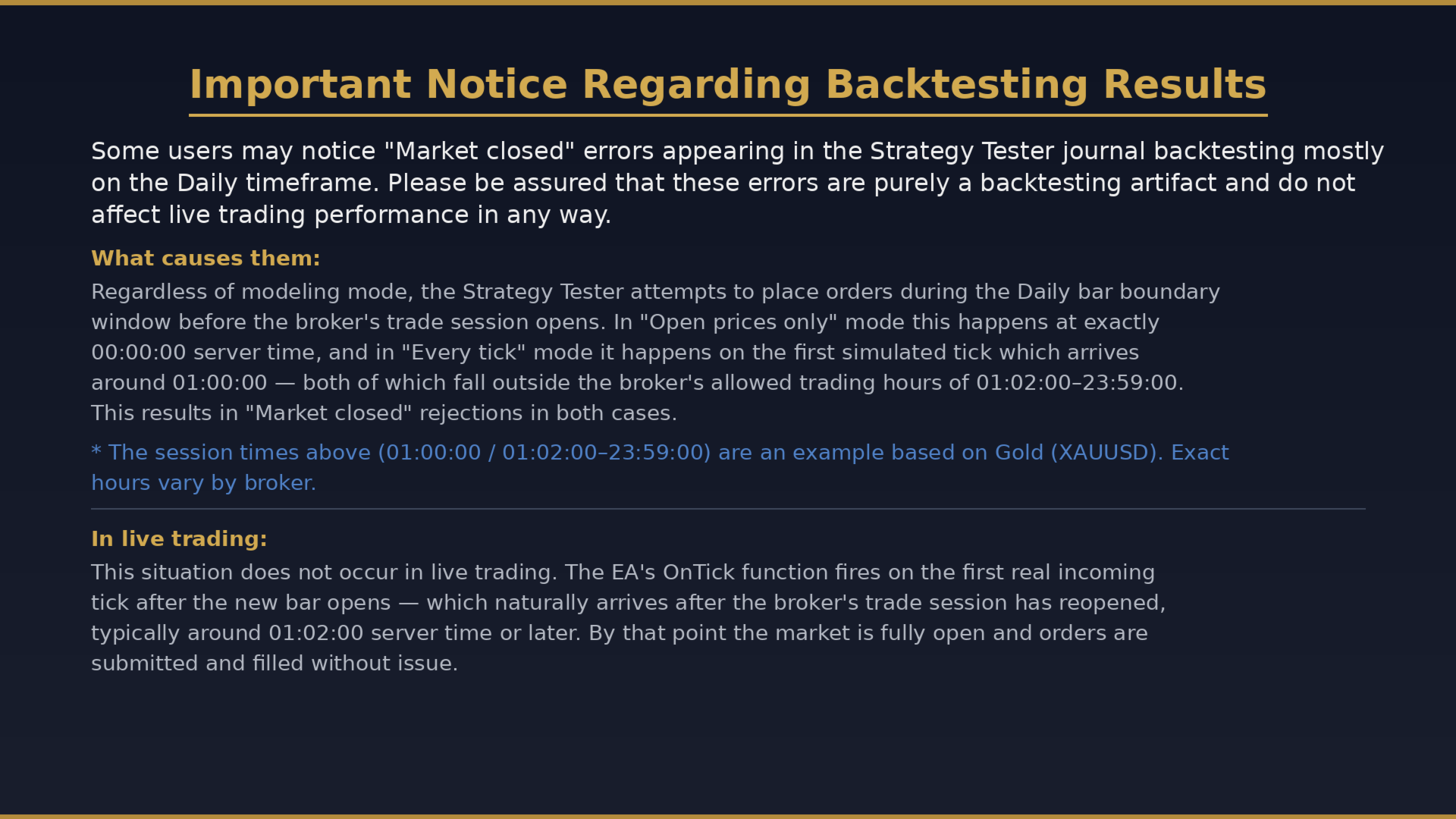 Der EA verarbeitet Signale bei Bildung einer neuen Kerze, prüft Breakout-Bedingungen ausschließlich anhand abgeschlossener Kerzen und steuert Ausstiege gemäß den definierten Regeln oder beim Erreichen des Stop-Loss. Wichtige Ereignisse werden protokolliert, um die Überwachung zu erleichtern.