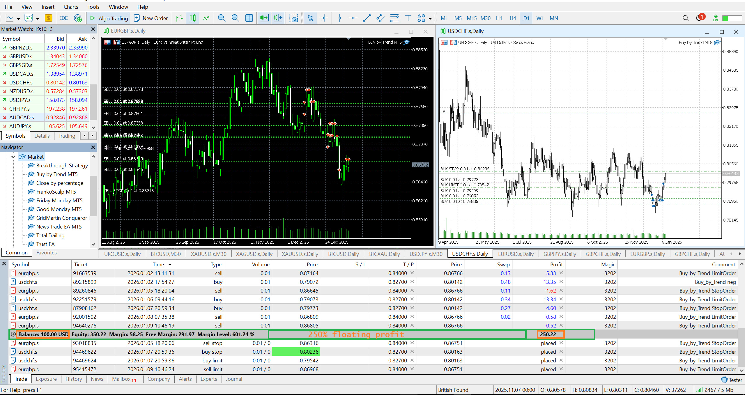A month after opening the first order, the floating profit reached 250%.