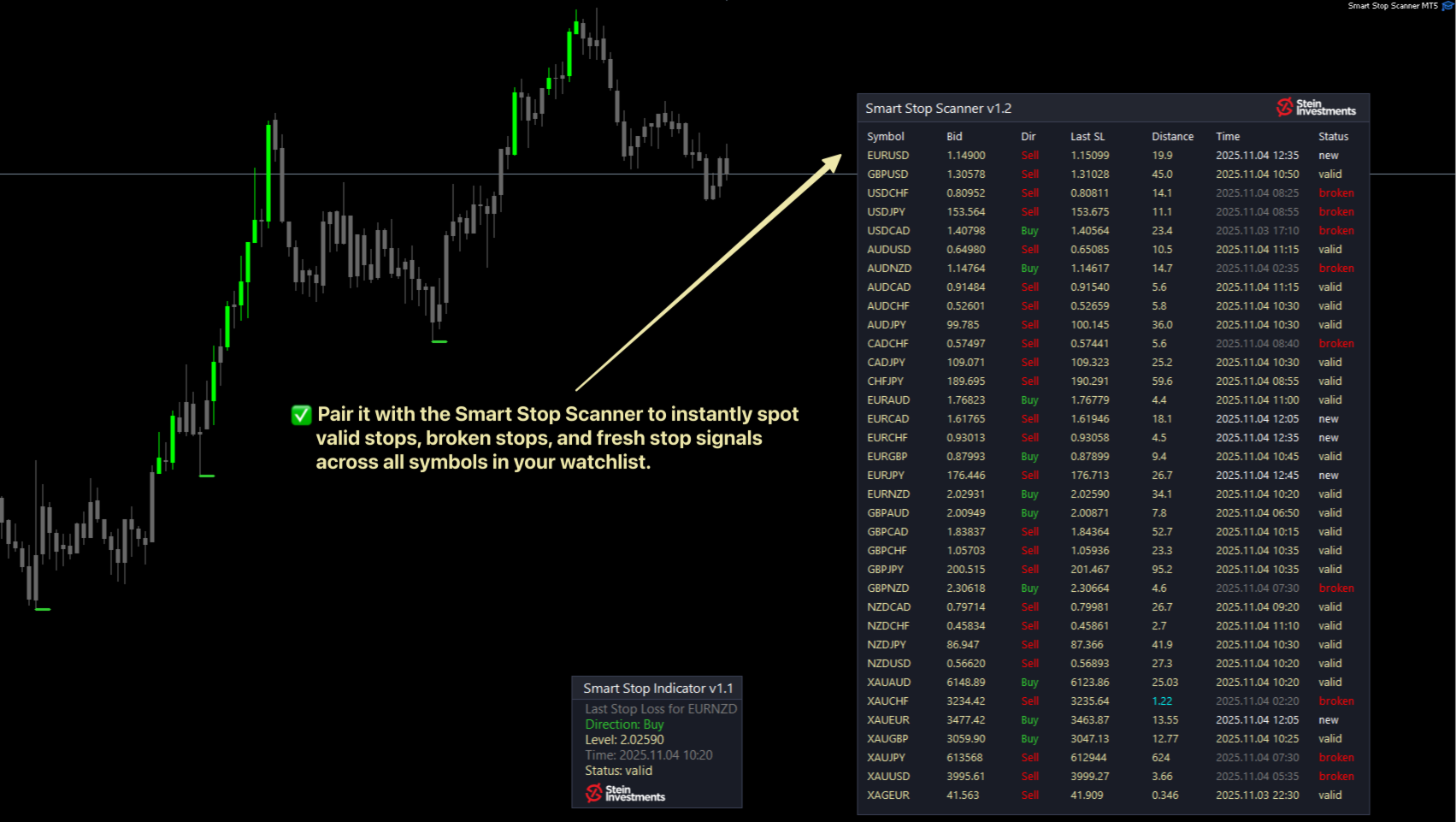 Kombinieren Sie den Smart Stop Indicator mit dem Smart Stop Scanner, um gültige, gebrochene und neu entstehende Stop-Level in Ihrer gesamten Watchlist sofort zu erkennen, während Sie gleichzeitig präzise Stop-Platzierungen direkt im Chart für jede Einzelposition behalten.