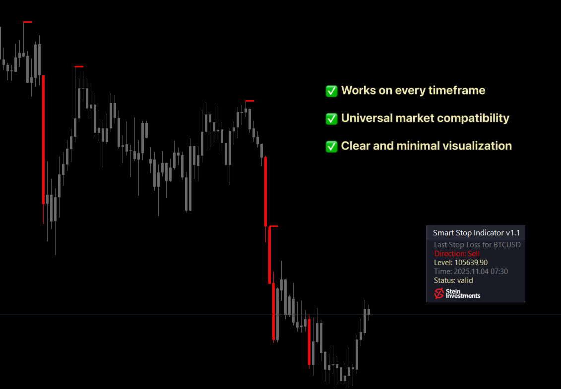 Mit dem Smart Stop Indicator erhalten Trader eine robuste, transparente und disziplinierte Stop-Loss-Methode, die sich an das Marktverhalten anpasst, Marktstruktur respektiert und langfristige Trends unterstützt, ohne starre mechanische Regeln.