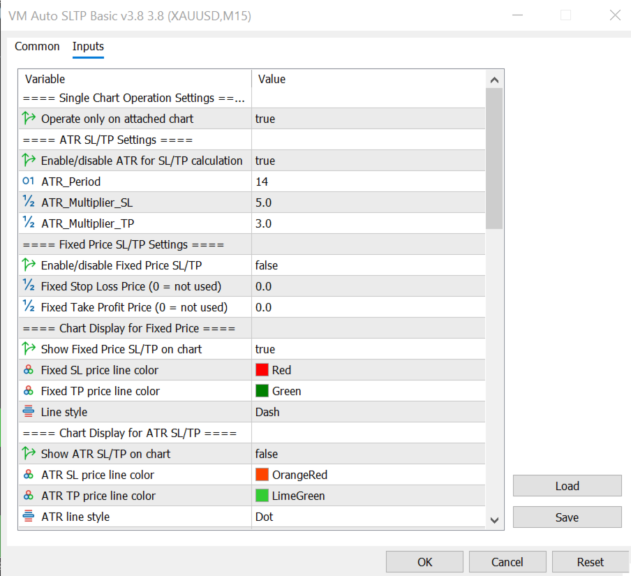 Wenn Kauf-/Verkaufssignale von SuperScalp Pro generiert oder vom Händler manuell platziert werden, wendet VM Auto SLTP Basic automatisch Stop-Loss- und Take-Profit-Niveaus an und verwaltet diese, wobei flexible Berechnungsoptionen auf Basis von ATR oder von festen Indikatoren abgeleiteten Kursniveaus zur Verfügung stehen.