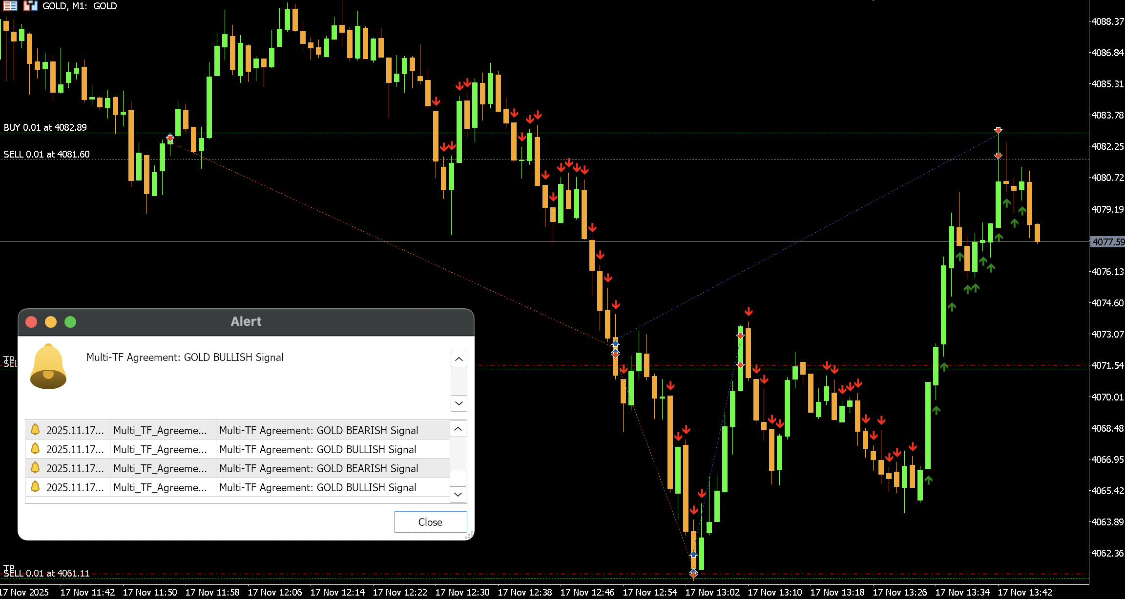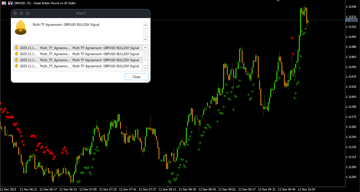 В итоге: это совершенно нормально, что стрелки не появляются длительное время. Индикатор работает правильно, просто ждёт идеального и сильного совпадения. Как только вы будете на графике M1, стрелки появятся, как только все условия будут выполнены.