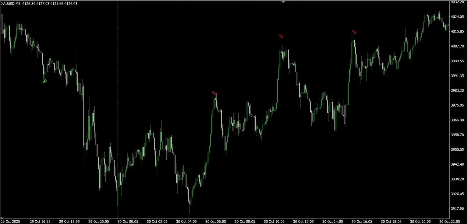 Platzierung der Pfeile: Die Pfeile werden dynamisch anhand einer ATR-Berechnung (Average True Range) platziert. Kaufpfeile erscheinen unter dem Tiefpunkt der Kerze und Verkaufspfeile über dem Hochpunkt der Kerze, so dass sie immer sichtbar sind.