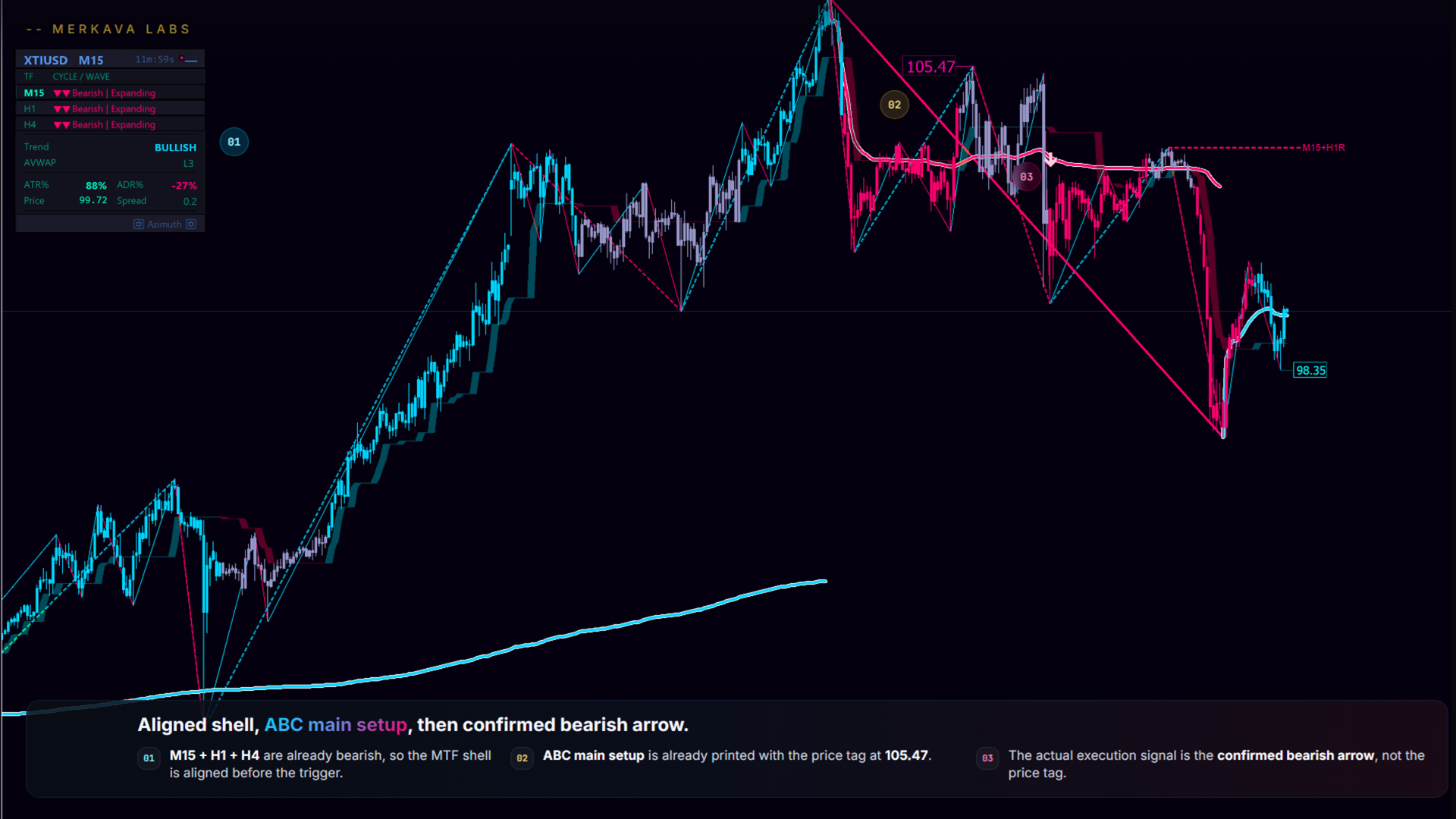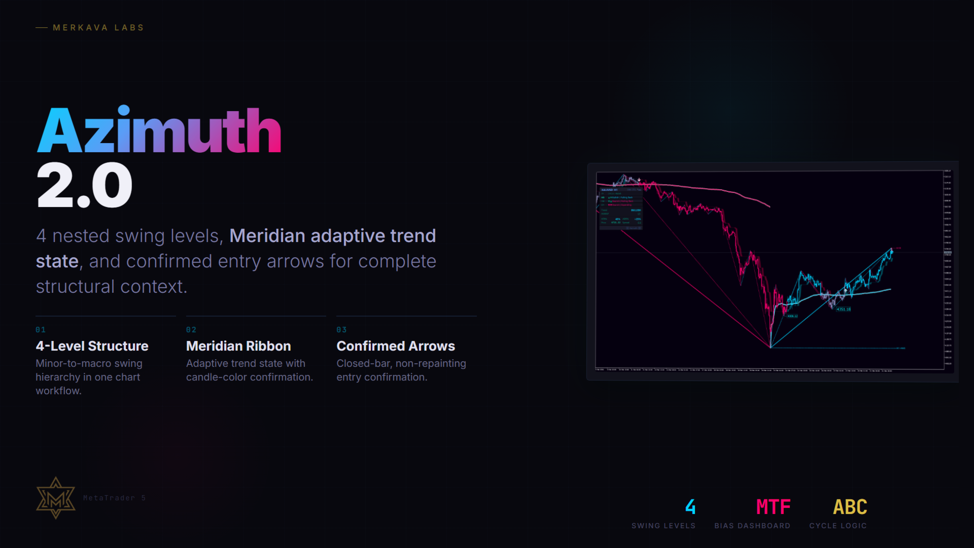 Azimuth ist ein Multi-Level-Swing-Structure-Indikator von Merkava Labs. Vier verschachtelte Swing-Ebenen, swing-verankerter VWAP, ABC-Mustererkennung und bestätigte Einstiegspfeile auf Schlusskursbasis, angetrieben von der adaptiven Meridian Trend Engine. Ein Chart, ein Workflow von Mikro-Swings bis Makro-Zyklen.
