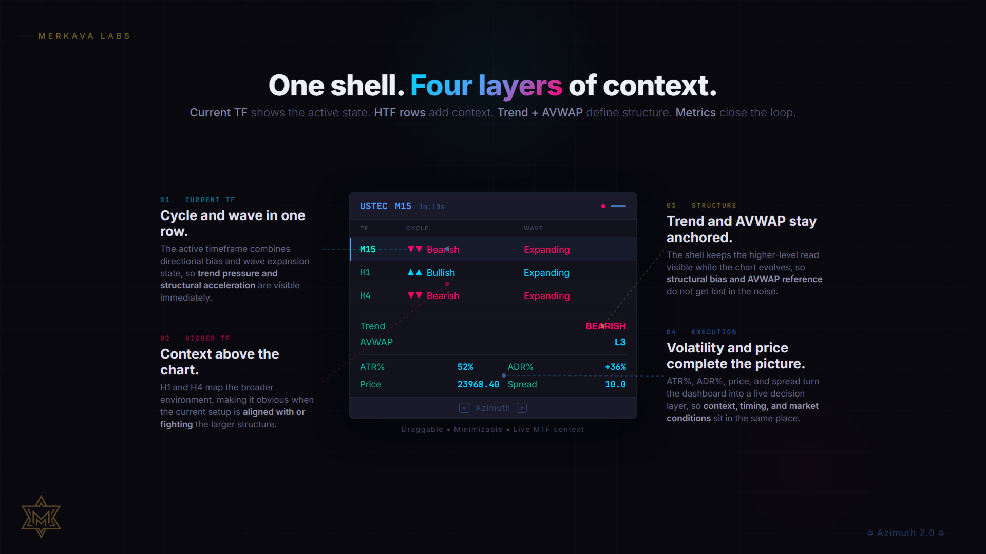 Für Trader, die synthetischen Multi-Timeframe-Kontext, Signal Quality Control und fortgeschrittene Confirmation Intelligence benötigen, ist Azimuth Pro separat in unserem Market-Portfolio verfügbar.