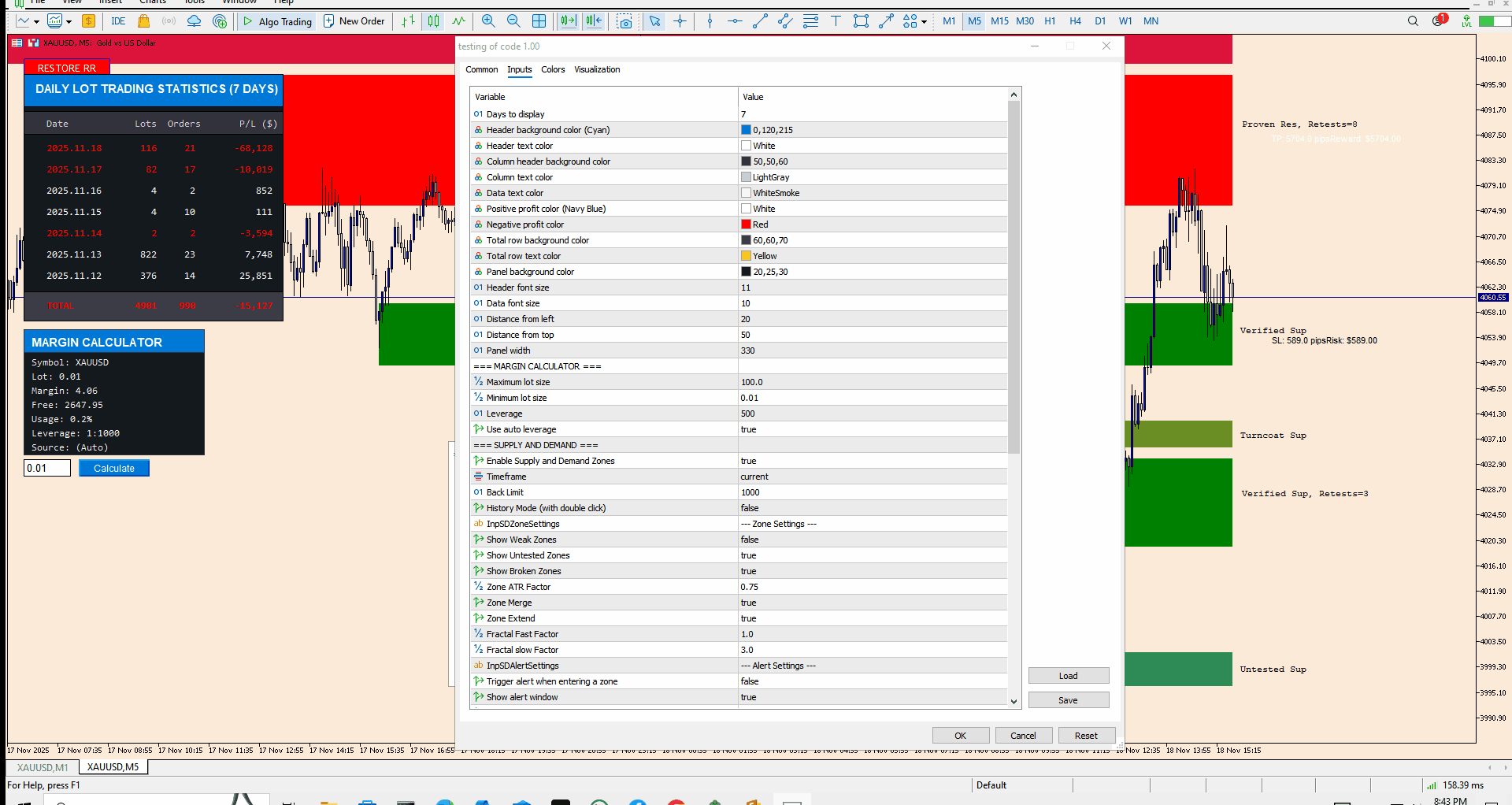 Es zeigt die Handelsaktivität der letzten sieben Tage an Es zeigt die Losgröße, die Anzahl der Orders und den Gewinn oder Verlust an Es addiert alle Tage Gewinn bringende Tage sind dunkelblau und Verlust bringende Tage sind rot
