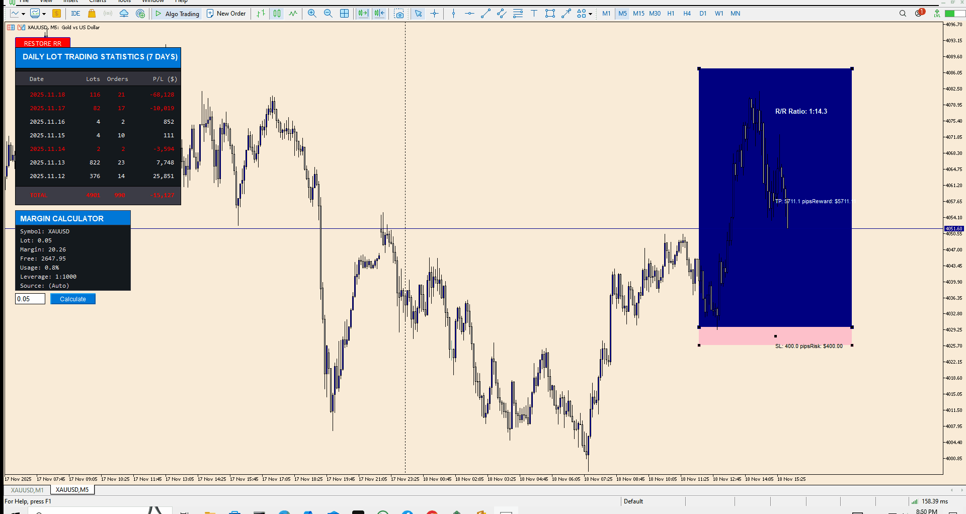 Es zeigt zwei Kästchen auf dem Chart an - ein rosafarbenes Kästchen für das Risiko und ein dunkelblaues Kästchen für die Belohnung Es zeigt das Verhältnis zwischen Risiko und Belohnung an Sie können die Kästchen verschieben und in der Größe verändern Es zeigt Pips und mögliches Geld für Risiko und Belohnung an