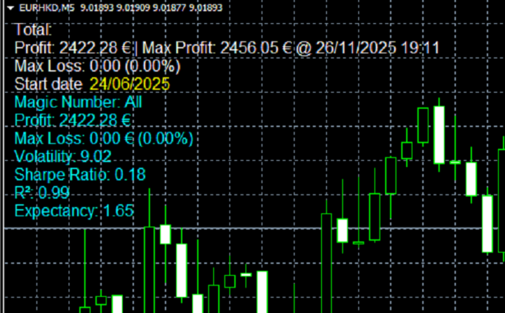 Er zeigt auf dem Bildschirm die wichtigsten Statistiken für das gesamte Konto und den aktuellen EA an, einschließlich Gewinne, maximale Verluste, professionelle Leistungskennzahlen und intelligente Warnmeldungen.