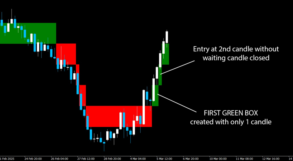 If the first box created only by single candle closed, you still can entry at second box without waiting the candle closed as the first box already formed by 1 candle closed earlier