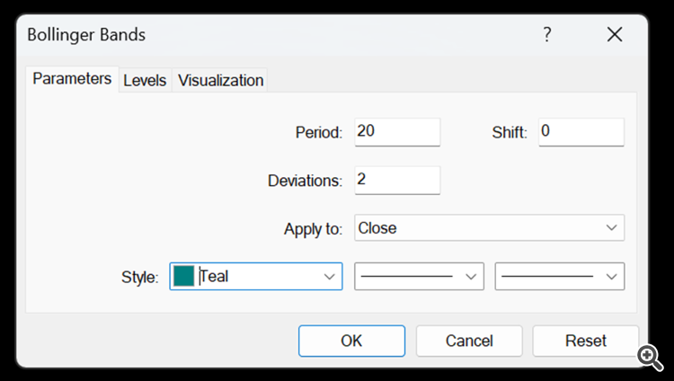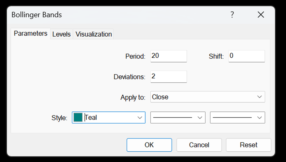 You can simply click reset button on the Bollinger Band setting and it will revert to this default setting