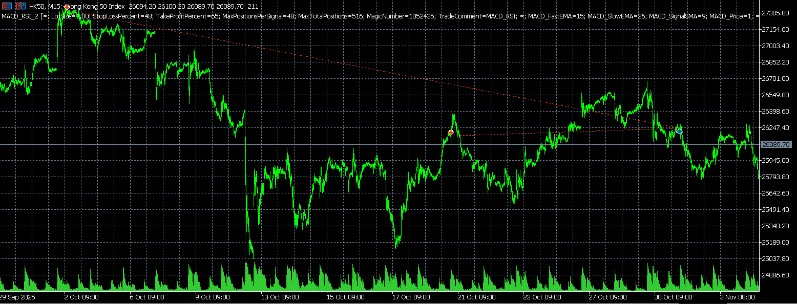 Zwei-Indikator-Logik: Verwendet den MACD, um die Trendrichtung zu erkennen, und den RSI, um das Einstiegs-Timing zu bestätigen, wodurch Fehlsignale während unruhiger Märkte reduziert werden.