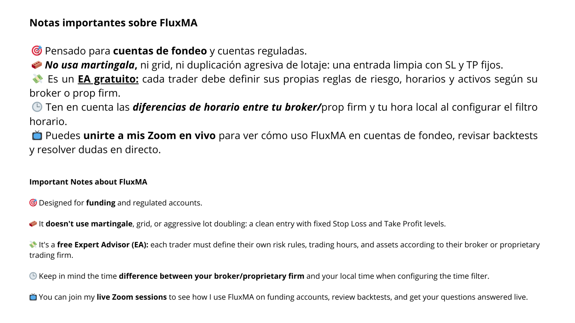 Risiko: FluxMA übernimmt keine Garantie für Gewinne oder zukünftige Ergebnisse. Es handelt sich um ein Ausführungsinstrument; der Benutzer ist für das Risikomanagement und die Auswahl der Parameter verantwortlich.