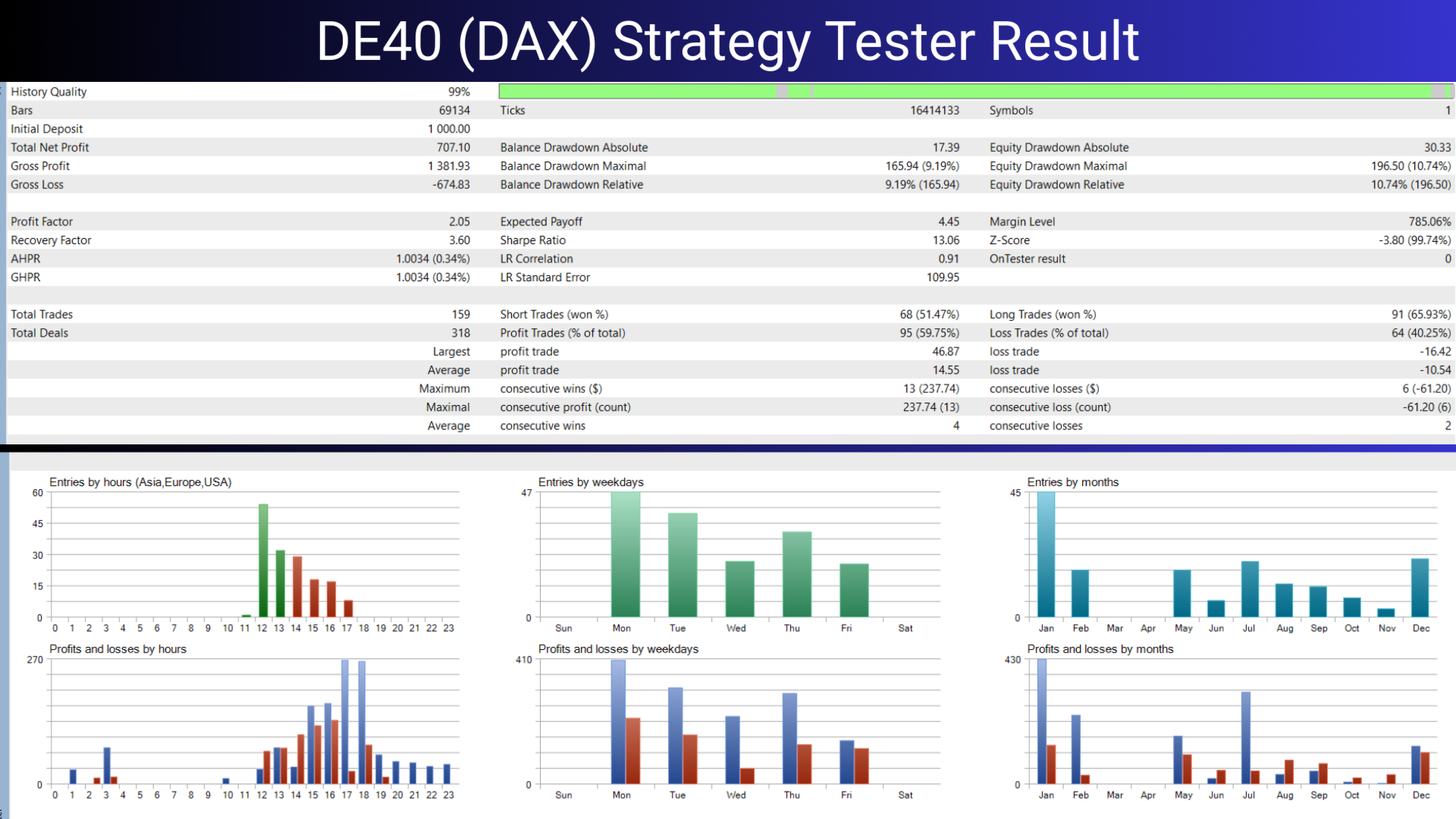 The European Engine (DE40): Aktiv während der Londoner Sitzung. Diese Engine sucht nach Ausbrüchen mit einer hybriden H1 Breakout + M5 Scaling Logik. Er fängt das frühe europäische Momentum ein.