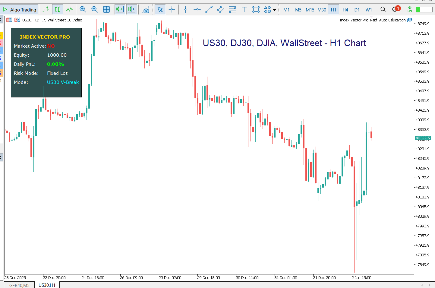Index Vector Pro ist ein spezialisiertes algorithmisches Handelssystem, das für den DAX40 (DE40) und US30 (Dow Jones) entwickelt wurde. Im Gegensatz zu Standard-Bots, die Konten einem unbegrenzten Risiko aussetzen, nutzt dieses System eine strikte zeitbasierte Struktur, um nur mit hochwahrscheinlichen Marktbedingungen zu handeln.