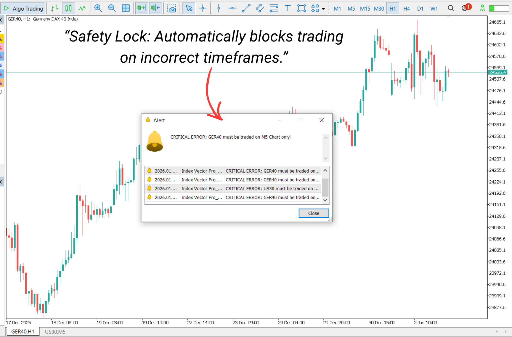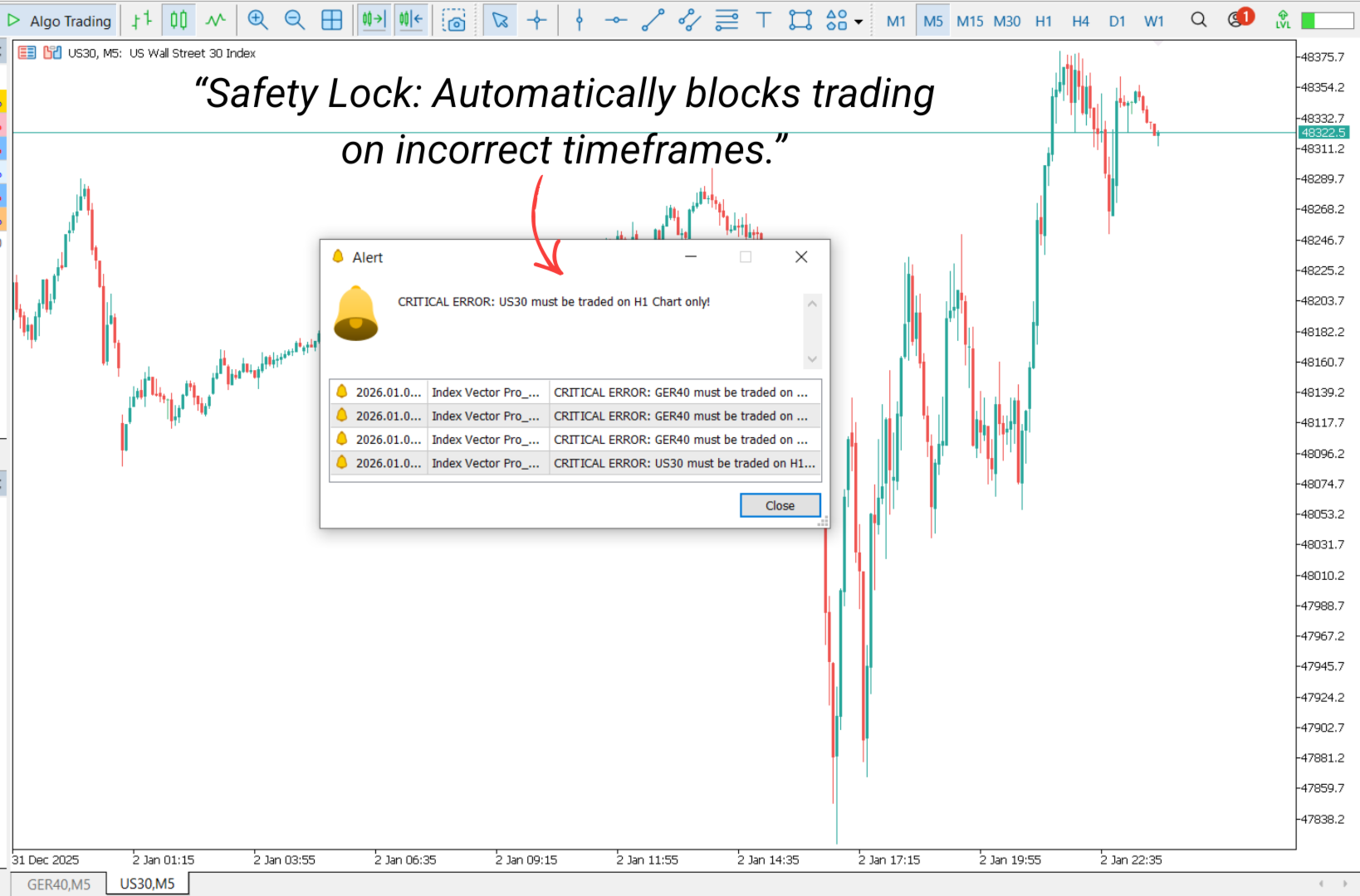 Intelligente Fehlererkennung: Wenn Sie den EA versehentlich dem falschen Zeitrahmen zuordnen (z. B. US30 auf M5), löst das System einen kritischen Alarm aus und deaktiviert sofort den Handel, um Ihr Konto zu schützen.