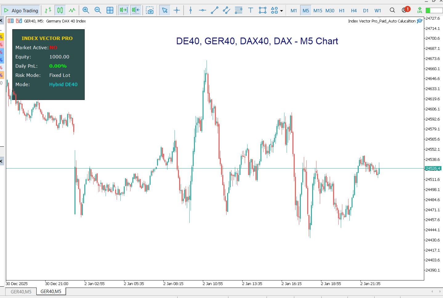- DE40 (DAX): Nur an den M5-Chart anhängen.