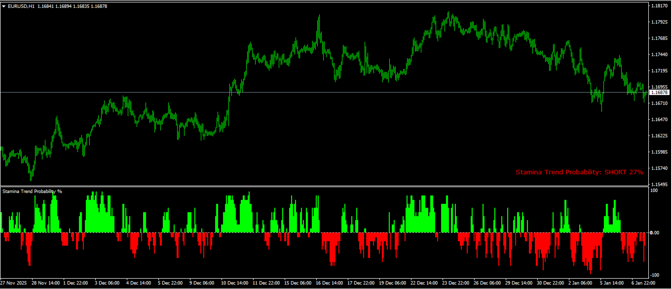 Der STAMINA-Trendwahrscheinlichkeitsindikator ist ein professioneller Indikator, der auf klare und quantitative Weise die Richtungswahrscheinlichkeit des Marktes anzeigt und dabei klar zwischen bullischem und bearischem Druck unterscheidet.