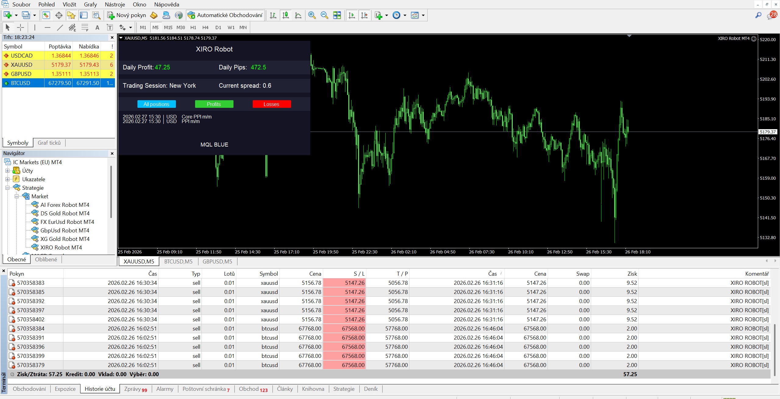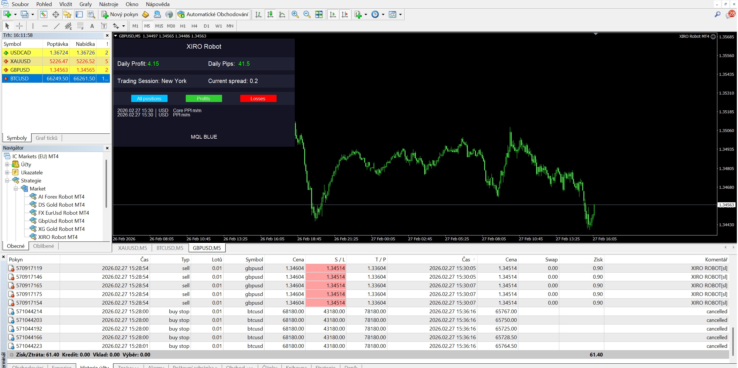 XIRO Robot is a professional trading system created to operate on two of the most popular and liquid instruments on the market: GBPUSD, XAUUSD and BTCUSD. We combined two proven and well tested systems, enhanced them with multiple new improvements, optimizations and additional protective mechanisms, and integrated everything into one advanced and unified solution. As a result of this development process, XIRO Robot was created. Robot was designed for traders who are looking for a reliable and structured tool that works every trading day and does not rely on random market behavior. The system operates on the M5 timeframe and opens trades daily under normal market conditions. Each position is fully protected and managed automatically using Take Profit, Stop Loss, Trailing Stop and Break Even mechanisms, ensuring disciplined and consistent trade management at all times. XIRO Robot is available for MetaTrader 4 and MetaTrader 5. The detailed manual is available in 10 languages: English, Chinese, Japanese, German, Korean, Polish, French, Spanish, Italian, and Arabic. After purchase users receive access to private group and additional guidance to ensure proper setup and usage. Frequently asked questions can be found at the bottom of the product page. After purchasing the robot please send me a private message to receive access to the group and the manual.