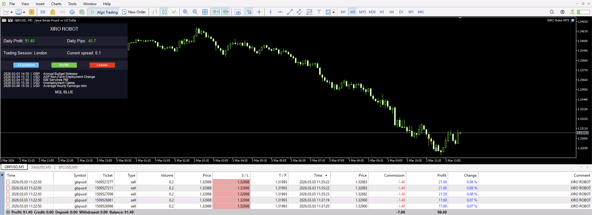 XIRO Robot is designed to work on GBPUSD, XAUUSD and BTCUSD combining advanced market analysis with adaptive trade management and controlled risk logic. The system focuses on precise entries, dynamic position handling and long term stability rather than random trading activity.