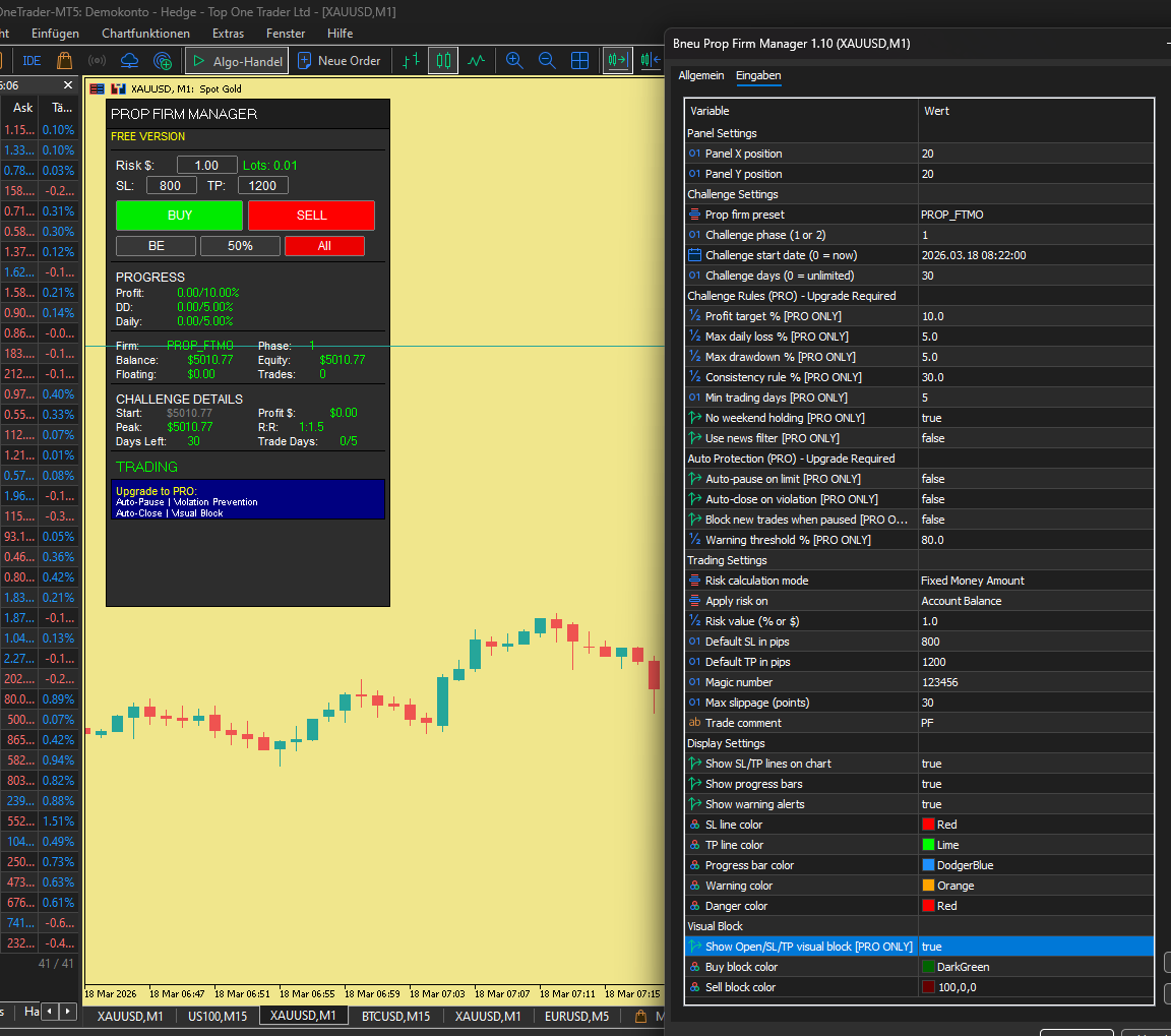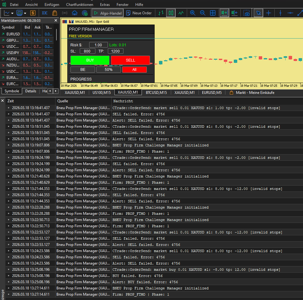 Hallo, ich habe eine Frage: Ich ein Handel über die Buy und Sell Butten im Prop Firm Manager Panel in dieser Version nicht möglich? Ich erhalte immer die Fehlermeldung SELL failed.Error: 4752