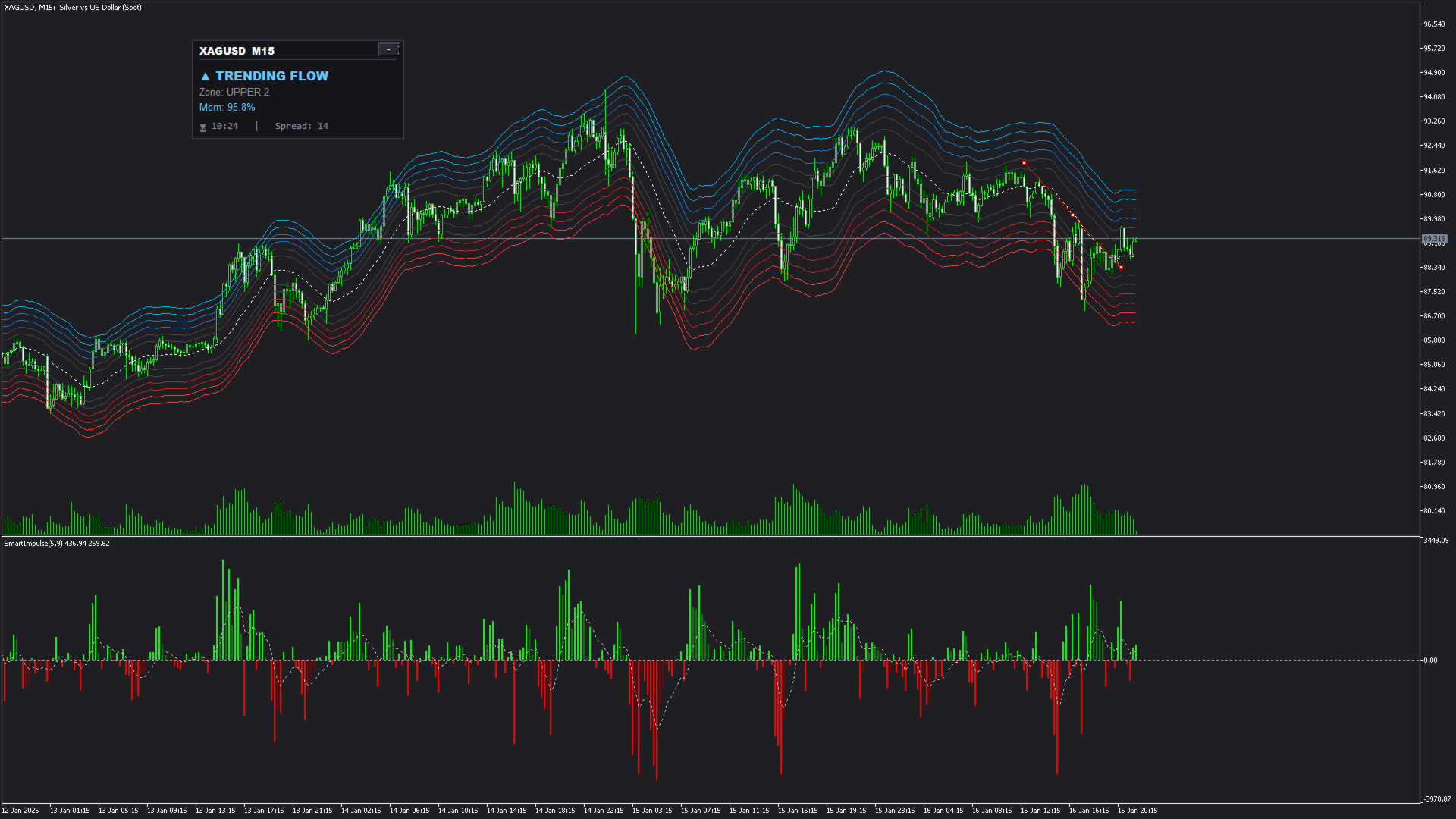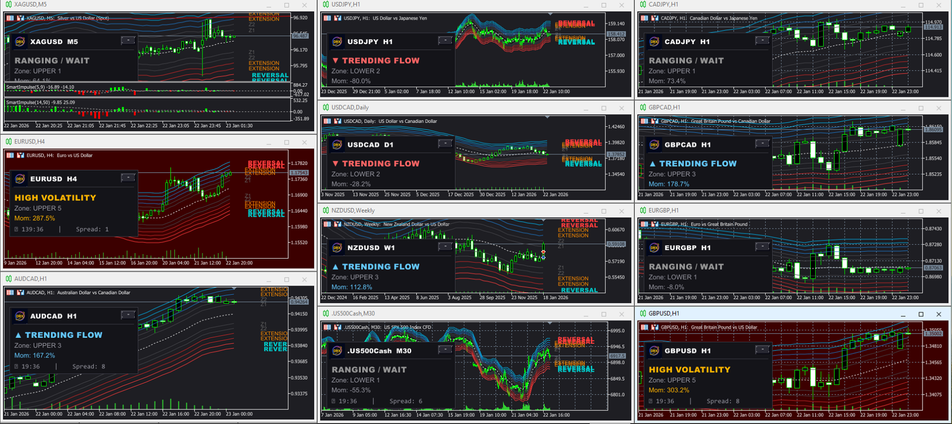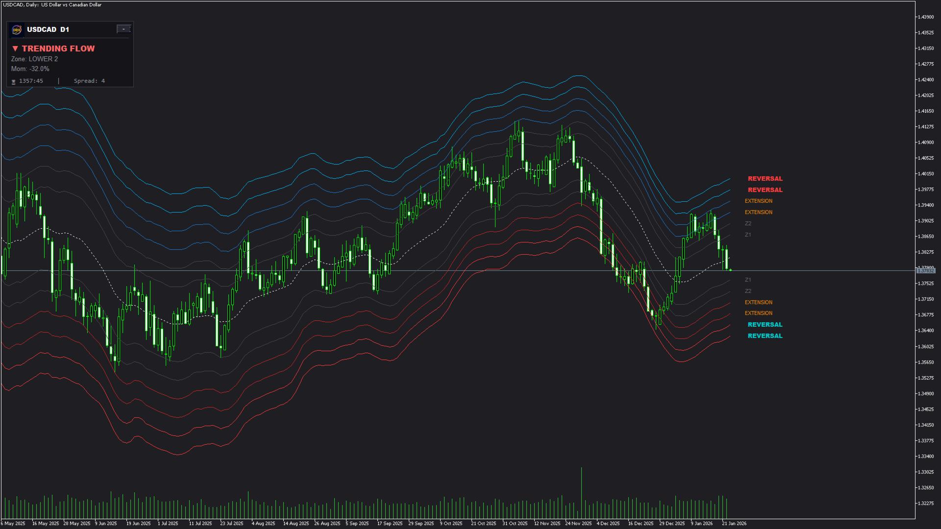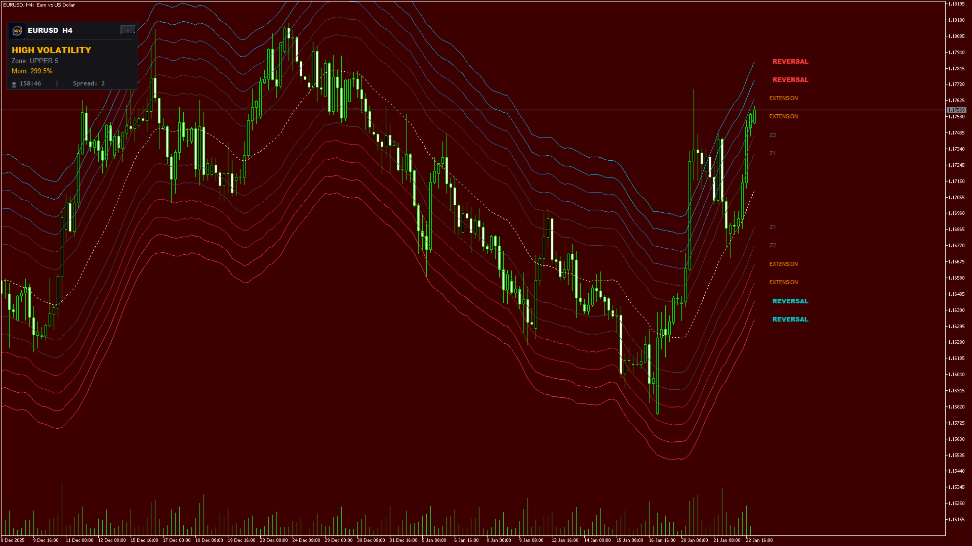 1. Auto-Adaptive Zonen (Intelligente Struktur) Das System projiziert dynamische Bänder auf Ihren Chart, die sich wie ein Gummiband dehnen und zusammenziehen.