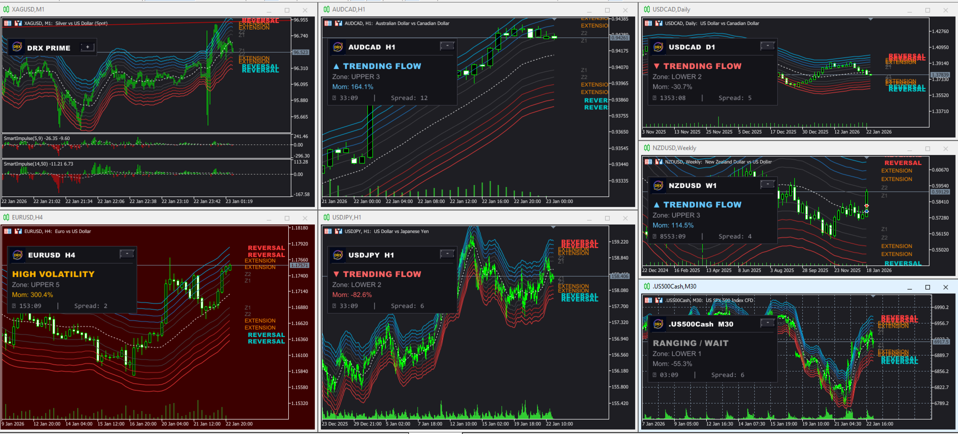 Viele Trader scheitern, weil sie die Übersicht verlieren. Der DRX Prime Flow löst dieses Problem durch Atmosphärische Visualisierung. Der Indikator kommuniziert nicht nur über Linien, sondern nutzt den gesamten Chart-Hintergrund, um Ihnen die entscheidenden Marktphasen anzuzeigen.