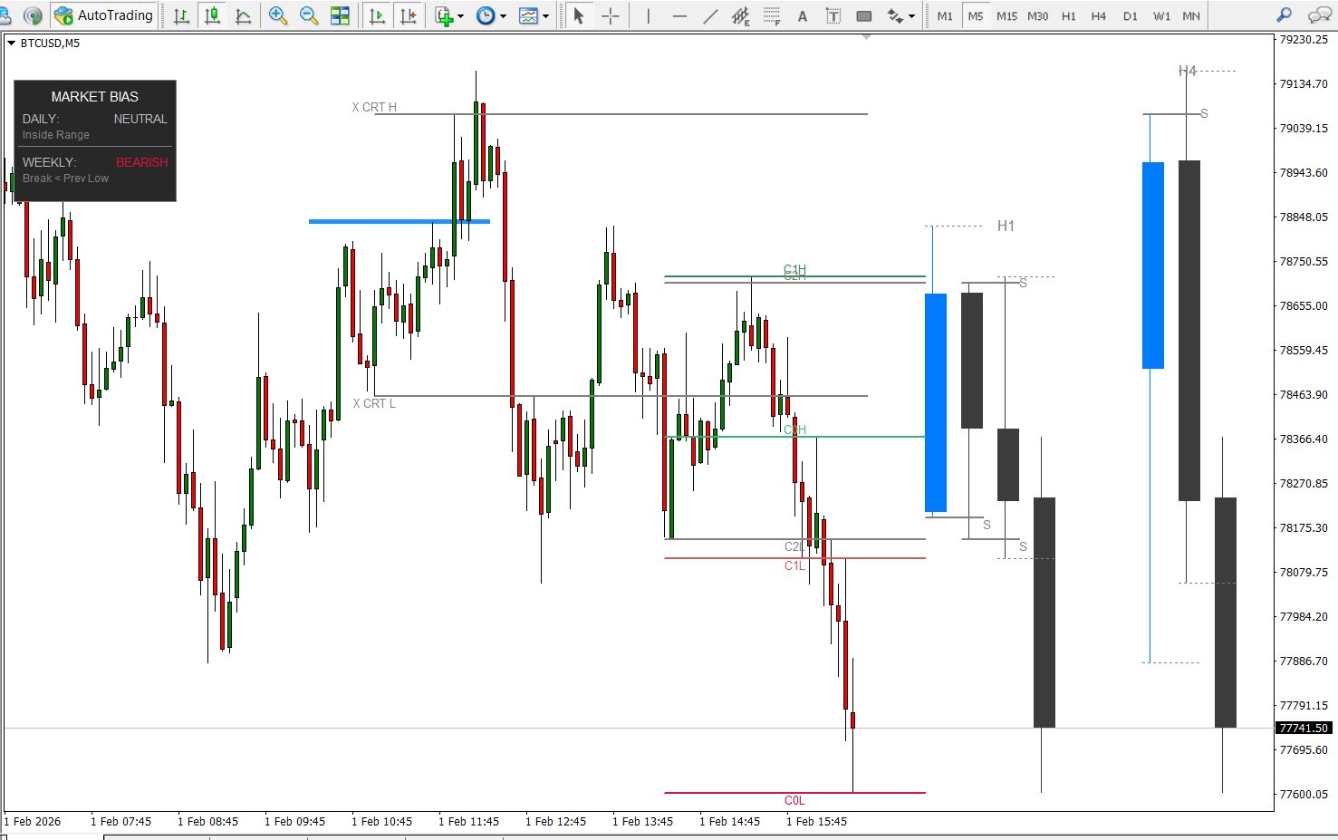COH / COL represent the current H1 candle high and low, with C1H/C1L and C2H/C2L marking prior HTF ranges.