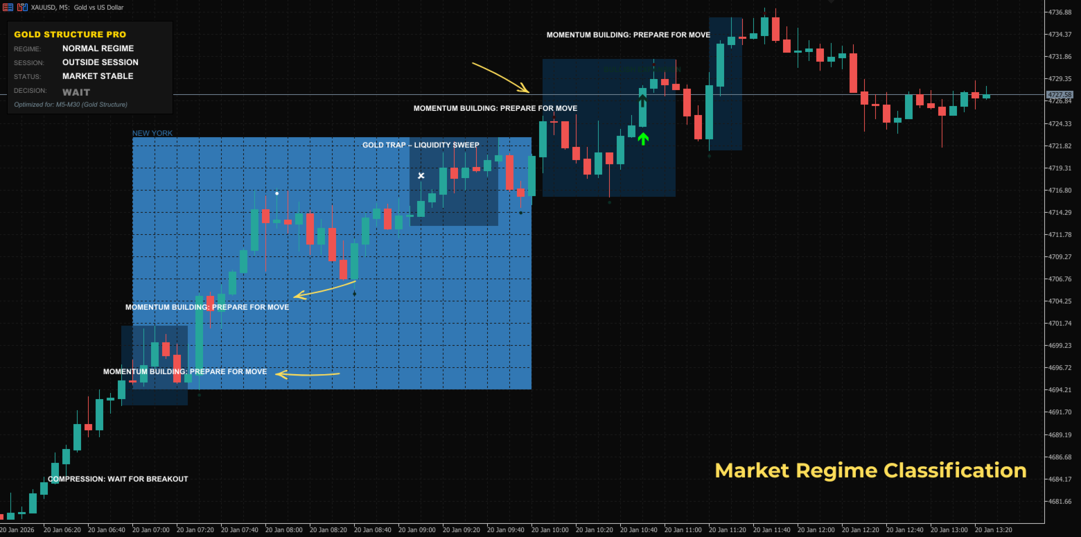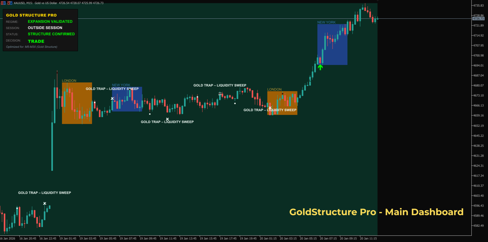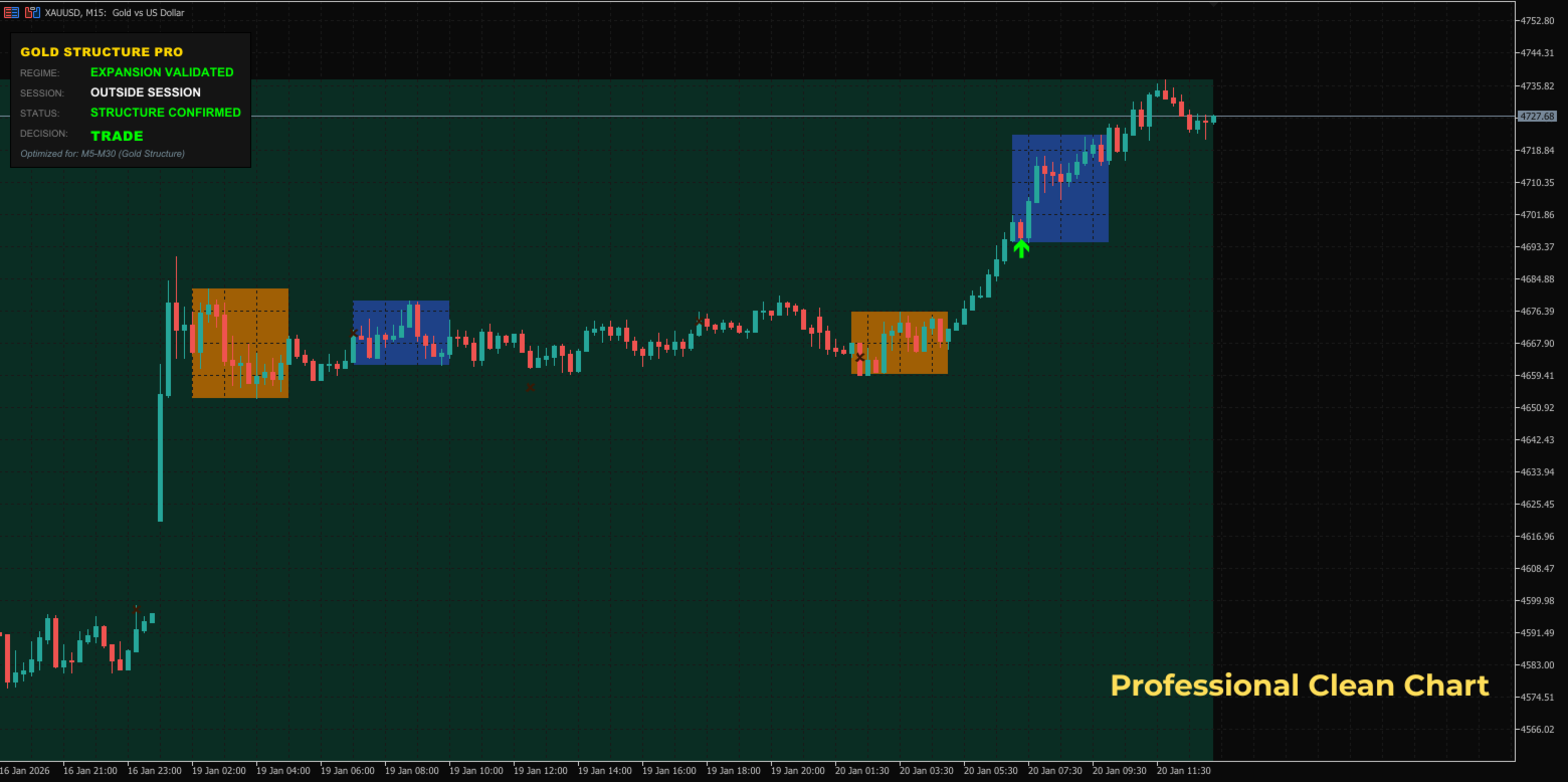 GoldStructure Pro ist eine professionelle Entscheidungsmaschine, die speziell für Goldhändler entwickelt wurde, die minderwertige Trades vermeiden und nur dann handeln möchten, wenn Volatilität und Struktur übereinstimmen.