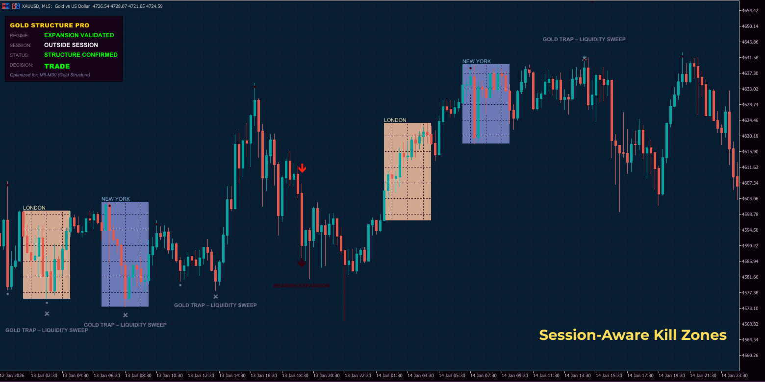 - Session-Aware Kill Zones: Visualisiert die Londoner und New Yorker Sitzungen, in denen die wahrscheinlichsten Bewegungen stattfinden.