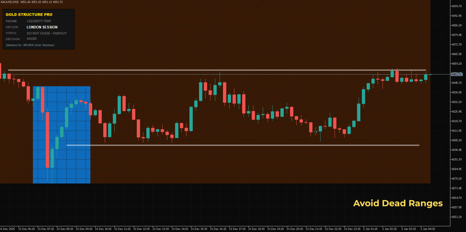 Die meisten Verluste beim XAUUSD entstehen durch den Handel in toten Bereichen oder durch falsche Ausbrüche.