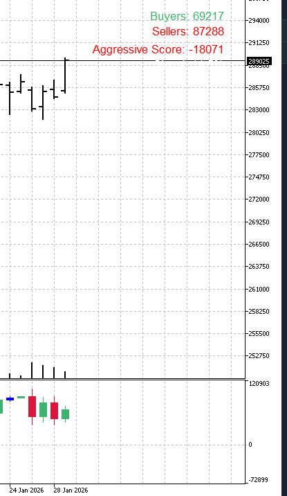 1. Вот скрин растущей ценовой свечи (бара) в моменте. Aggressive Score отрицательный, т.е. рыночных продавцов больше, чем рыночных покупателей. Но дельта-свеча при этом зеленая. Верна ли интерпретация, что в этой ценовой свече много пассивных (лимитных) покупателей и рост цены должен продолжиться?