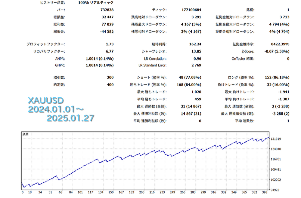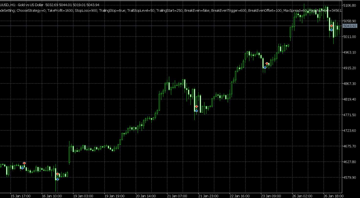 Er führt Scalping durch, indem er Trends folgt, wobei der Schwerpunkt auf dem Kauf von Dips und dem Verkauf von Rallys liegt. Damit eignet er sich gut für die starken Trendbewegungen des Goldes, die seit 2024 zu beobachten sind.