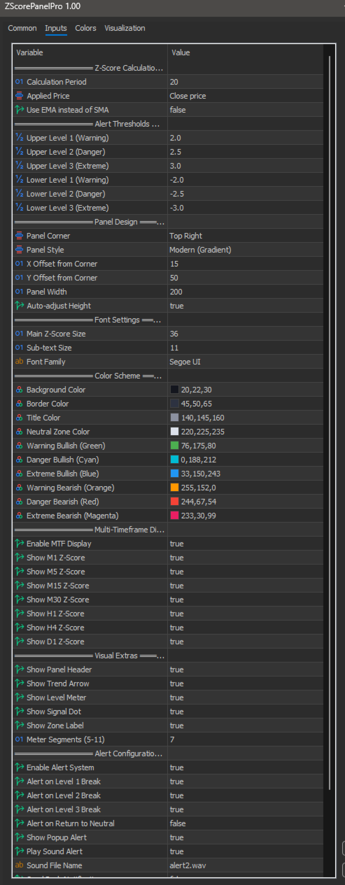 Z-Score Panel Pro bietet umfangreiche Anpassung mit über 40 Parametern, die in logische Gruppen organisiert sind. Für vollständige Parametererklärungen, Berechnungsformeln und Konfigurationsbeispiele verweisen Sie bitte auf den oben verlinkten detaillierten Blog-Leitfaden.