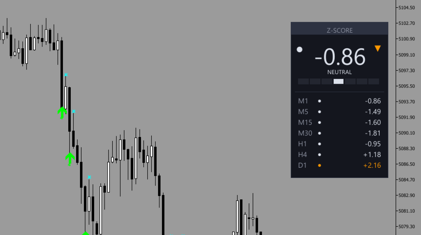 - Multi-Zeitrahmen Z-Score Anzeige: Überwachen Sie Z-Scores auf 7 Zeitrahmen gleichzeitig (M1, M5, M15, M30, H1, H4, D1) mit unabhängigen Berechnungen für umfassende Marktanalyse