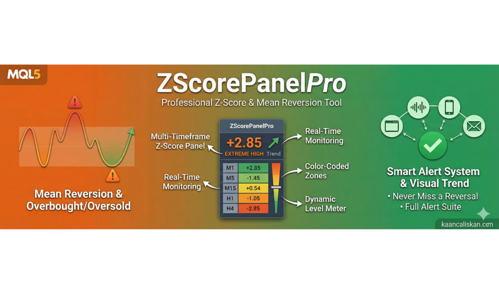 Im Gegensatz zu grundlegenden Z-Score-Indikatoren bietet Z-Score Panel Pro eine vollständige Überwachungslösung mit Multi-Zeitrahmen-Analyse (von M1 bis D1), anpassbaren Schwellenwerten, visuellen Trendindikatoren und einem intelligenten Alarmsystem, das Sie per Popup, Sound, Push-Benachrichtigung oder E-Mail benachrichtigt, wenn signifikante Z-Score-Level durchbrochen werden.