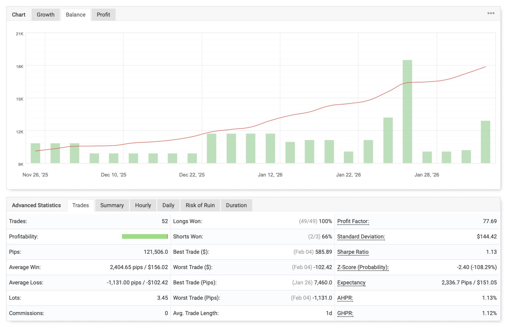 - Statistische Überwachung: Das System sammelt automatisch Daten über Handelsaktivitäten, wendet statistische Analysen auf historische Trades an und nutzt die daraus resultierenden Schlussfolgerungen, um zukünftige Entscheidungen zu treffen. Auf diese Weise erhält der Expert Advisor eine objektive Bewertung seiner Leistung und kann seine Strategien anpassen, um die Wirksamkeit der oben beschriebenen Handelsmethoden zu verbessern.