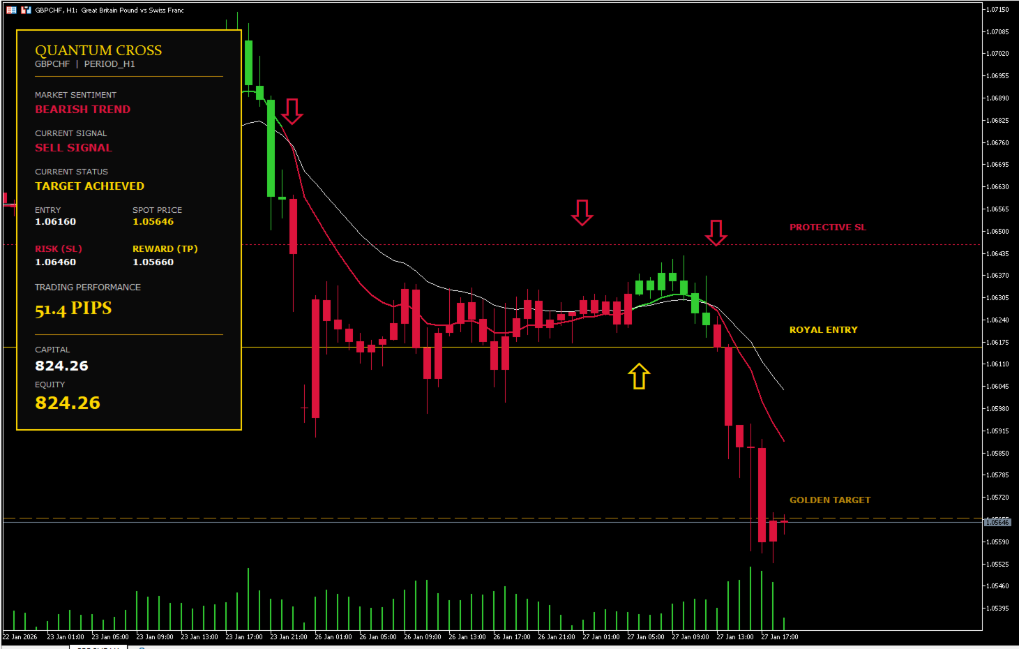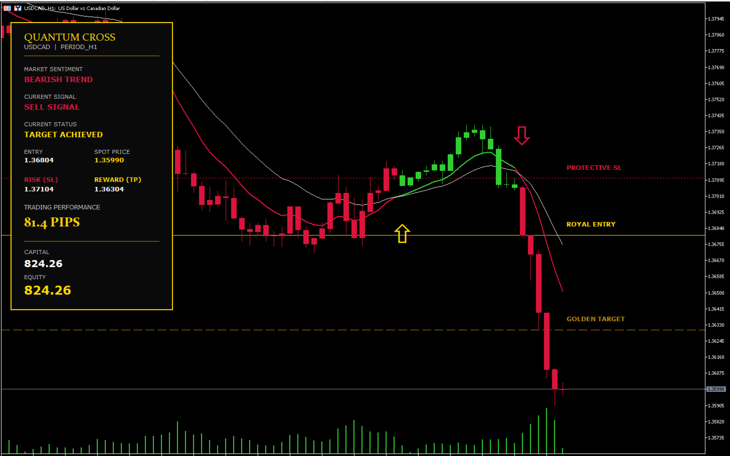 Bearish Quantum Cross: Tritt auf, wenn der Fast EMA unter dem Slow EMA kreuzt. Das System färbt die Kerzen tiefrot und signalisiert damit eine höchstwahrscheinliche Short-Gelegenheit (Verkauf).