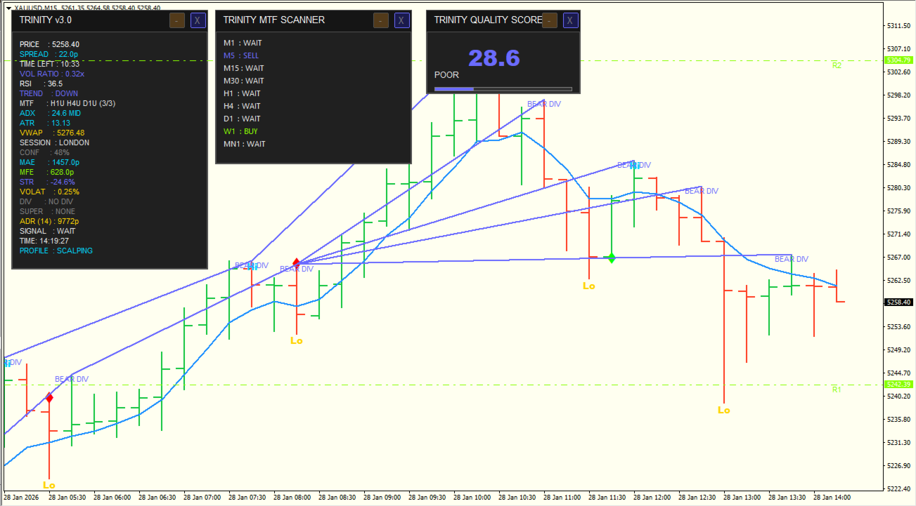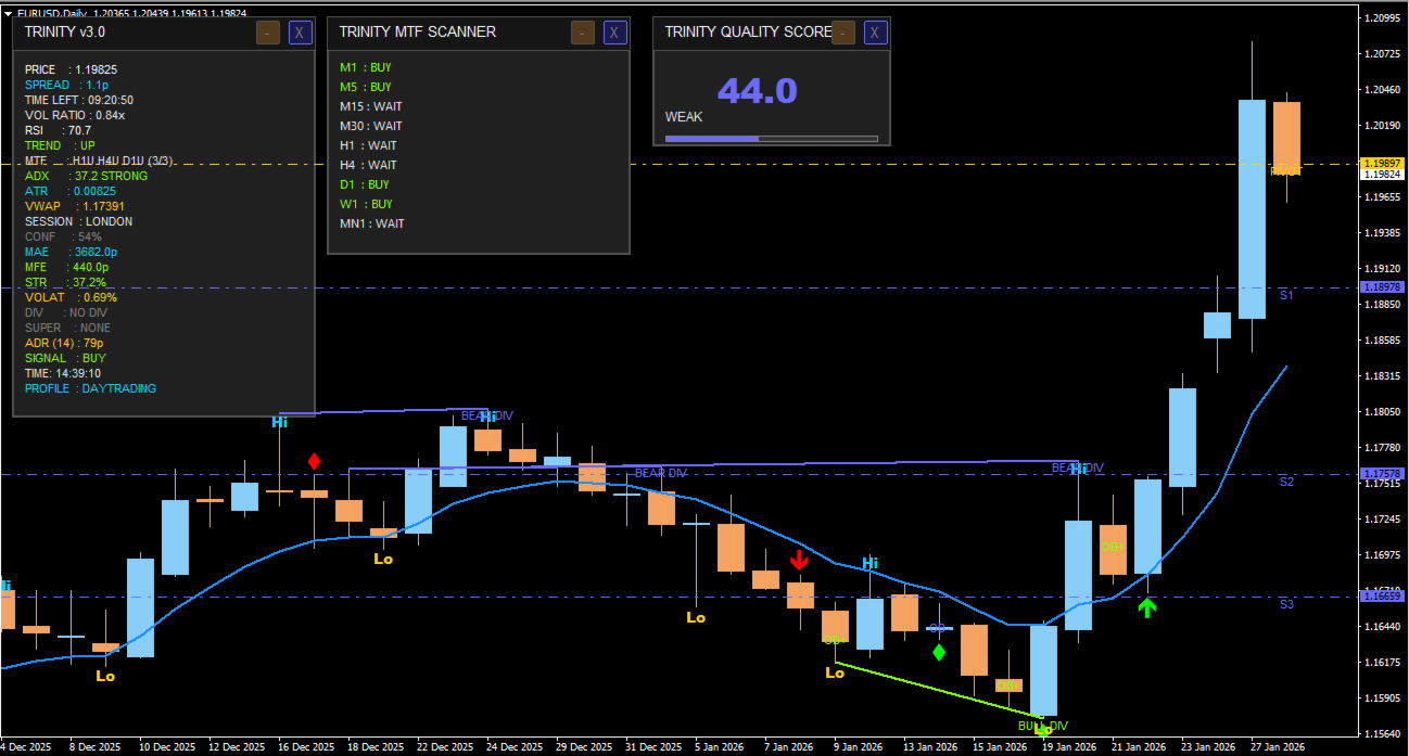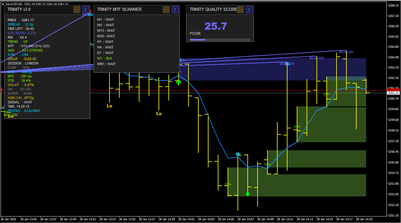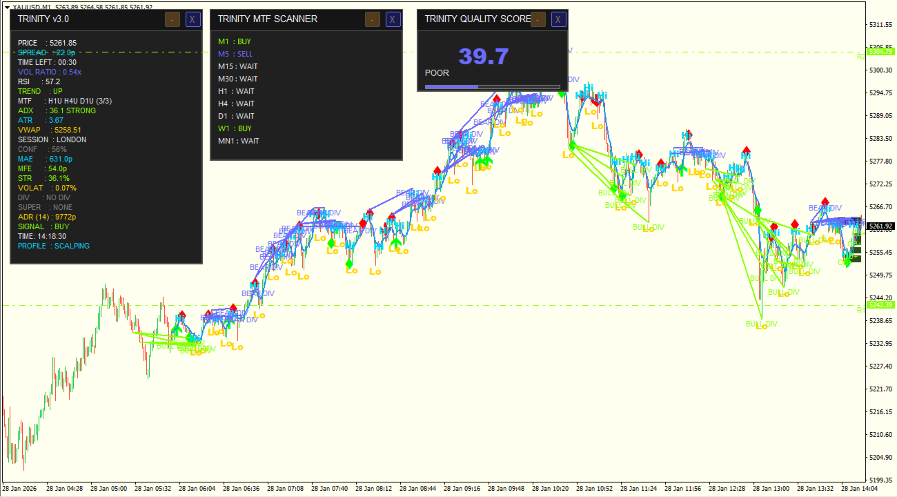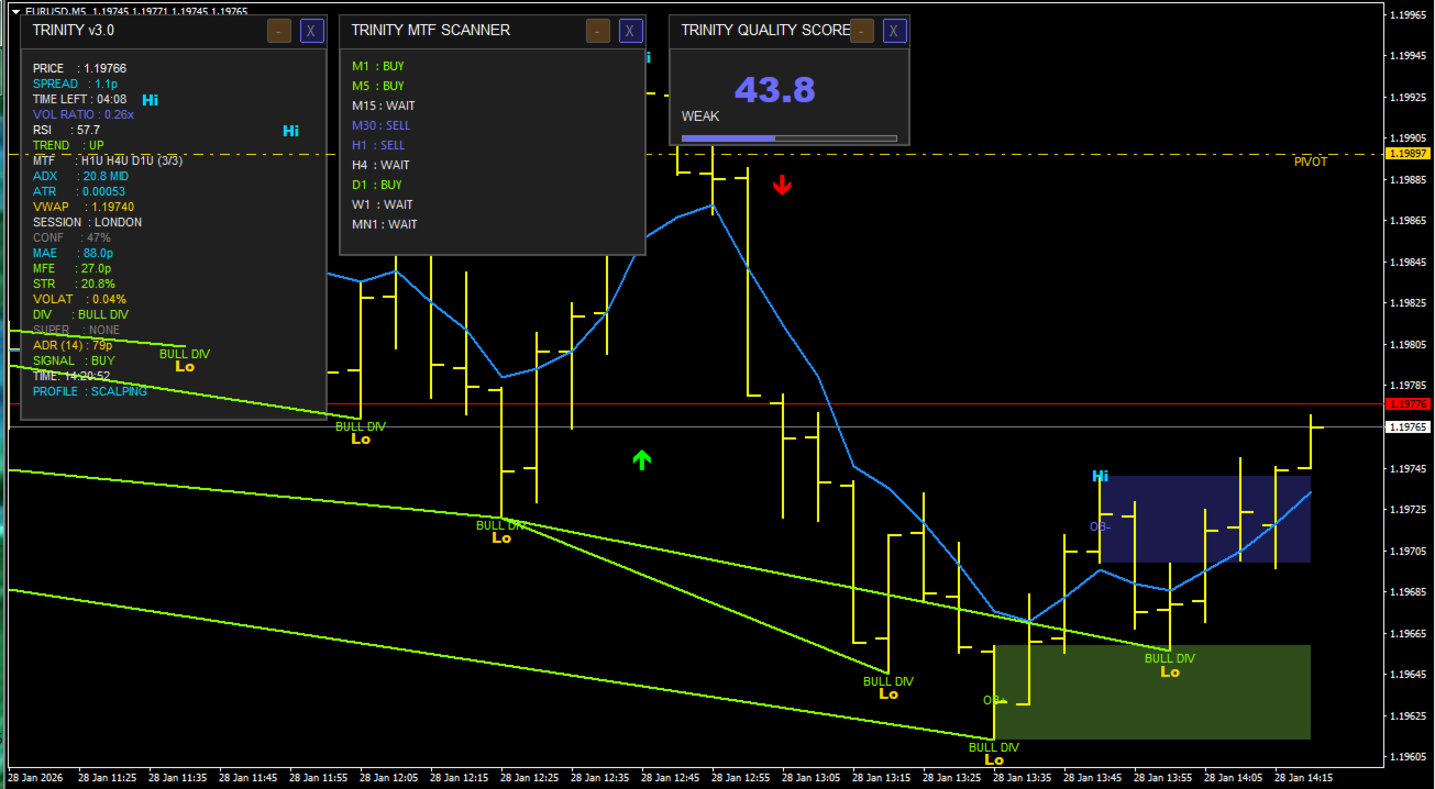 Trinity Suite ist nicht nur ein Indikator, sondern ein komplettes Handelssystem für Scalper, Day Trader und Swing Trader, die Präzision verlangen.