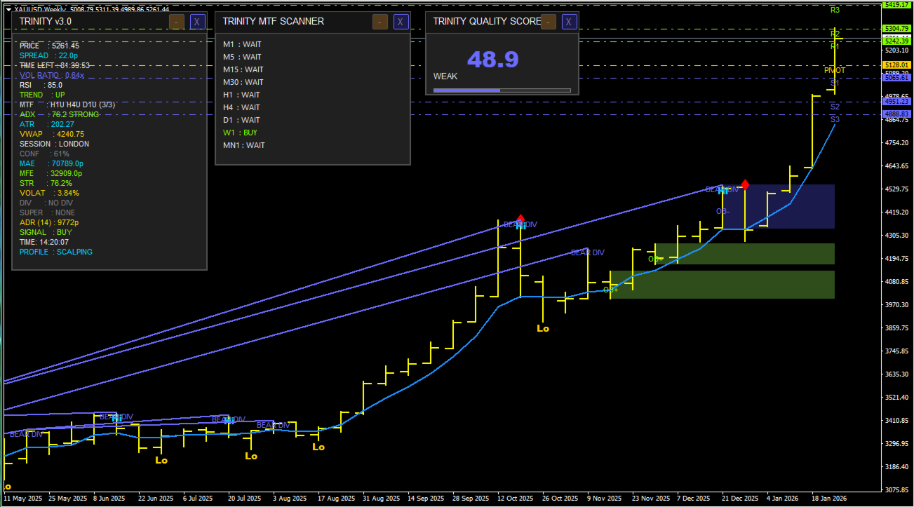 Sind Sie es leid, die Marktrichtung zu erraten? Rüsten Sie Ihren Trading-Schreibtisch mit Trinity Suite v3.0 auf, dem institutionellen All-in-One-Dashboard, das Marktstruktur, Trendintelligenz und Momentum-Validierung in einem einzigen, nicht übermalenden Tool vereint.