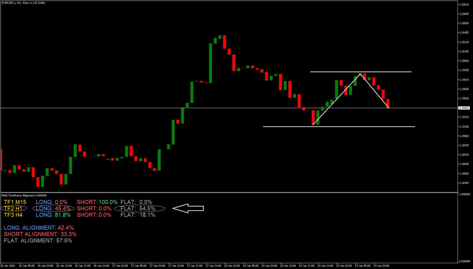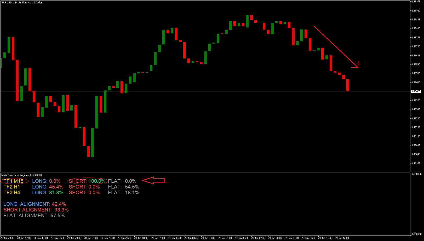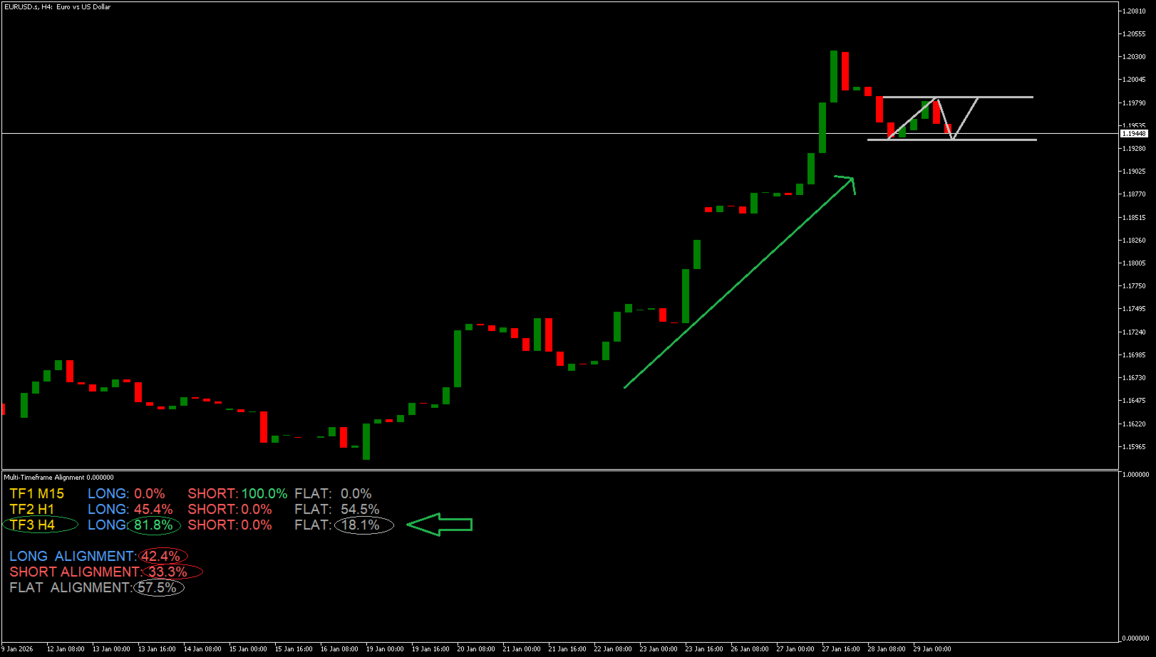 Die Prozentwerte neben jedem Zeitrahmen zeigen die LONG-, SHORT- und FLAT-Ausrichtung dieses Zeitrahmens, während die finalen Werte LONG ALIGNMENT, SHORT ALIGNMENT und FLAT ALIGNMENT den Durchschnitt der ausgewählten Zeitrahmen darstellen und so eine klare, unmittelbare und quantitative Einschätzung des Multi-Timeframe-Marktumfelds ermöglichen 📊