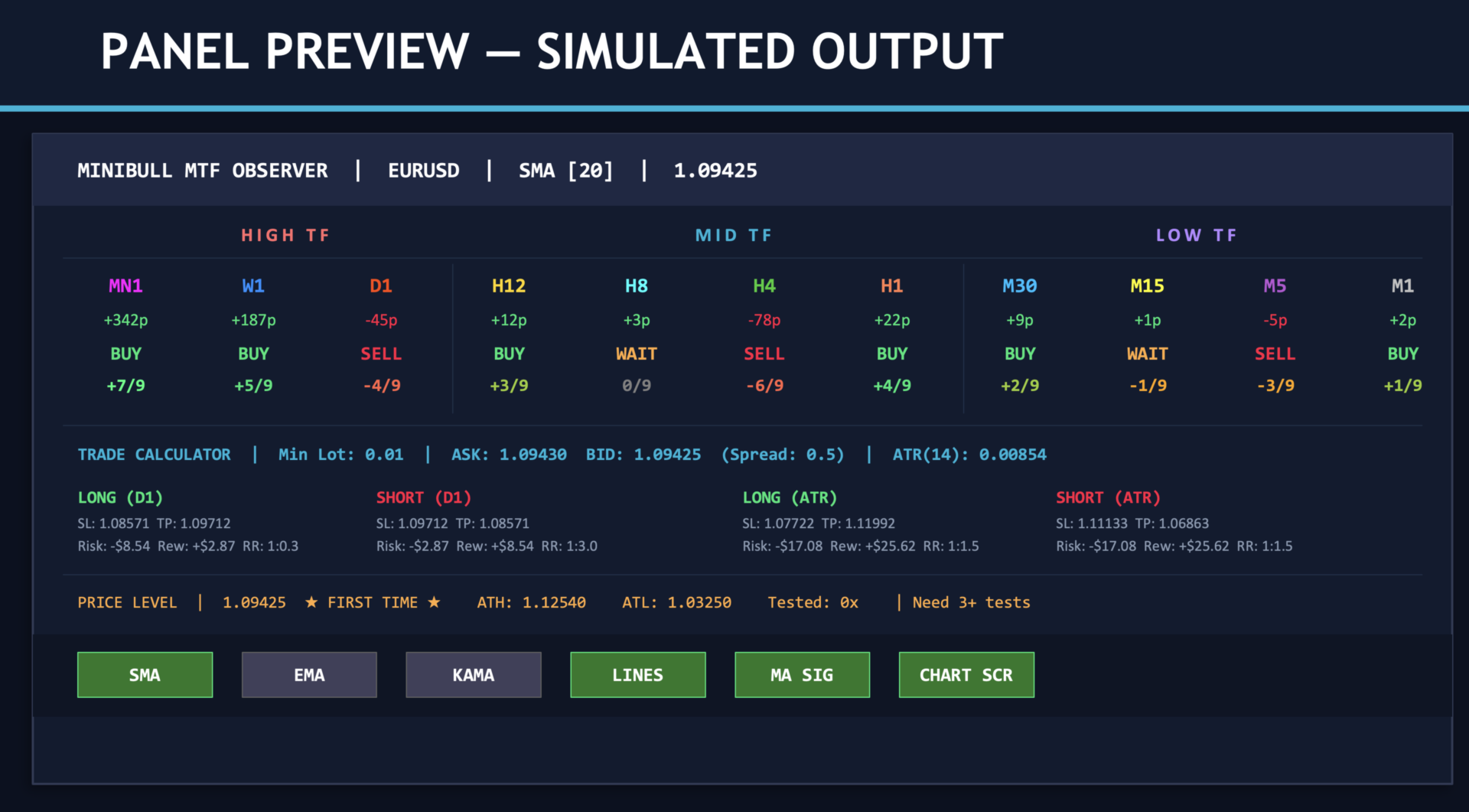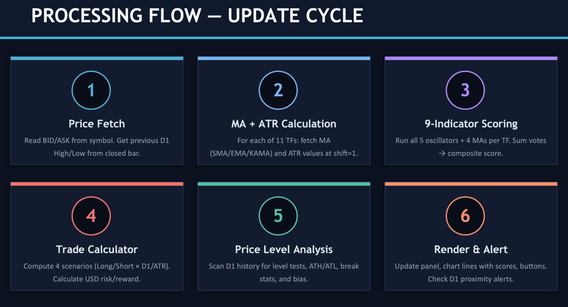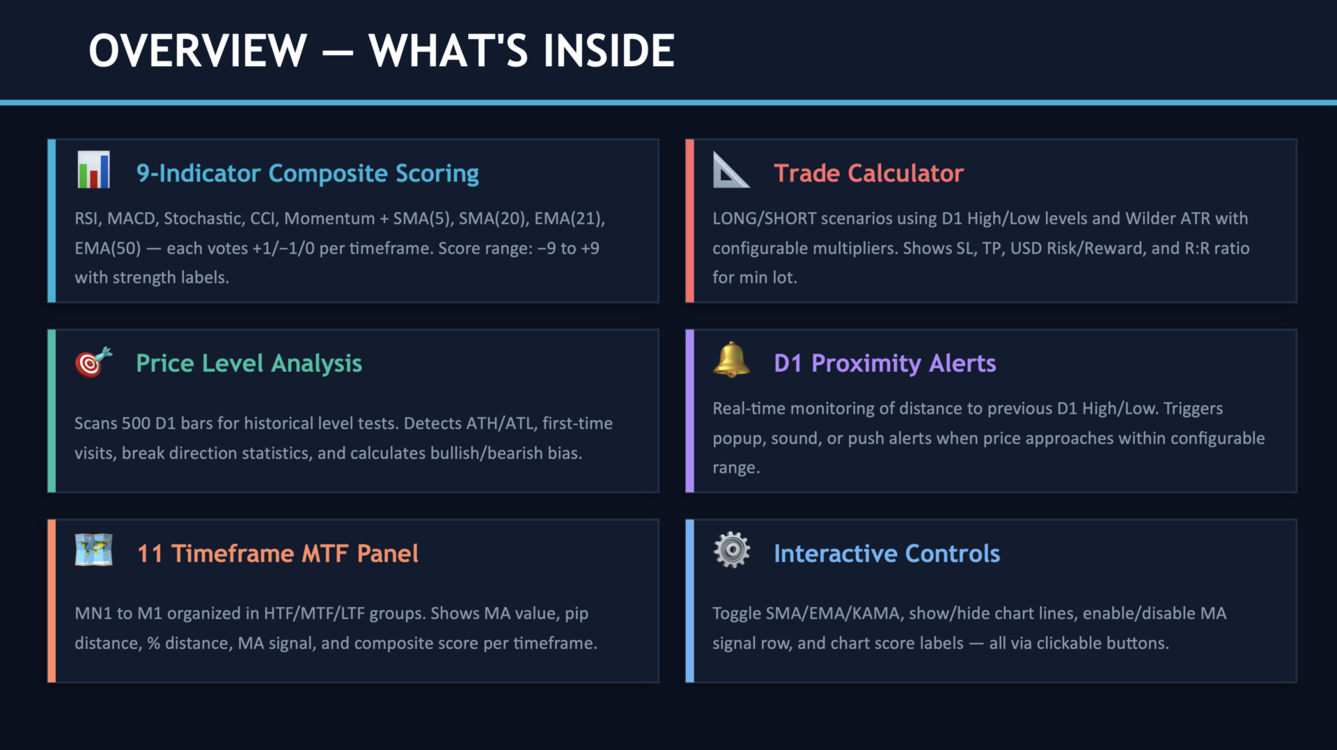 Das ultimative Multi-Indikator-Dashboard! Analysiert 9 verschiedene technische Indikatoren über 11 Zeitrahmen gleichzeitig und liefert einen Composite-Score von -9 bis +9 für jeden Zeitrahmen.